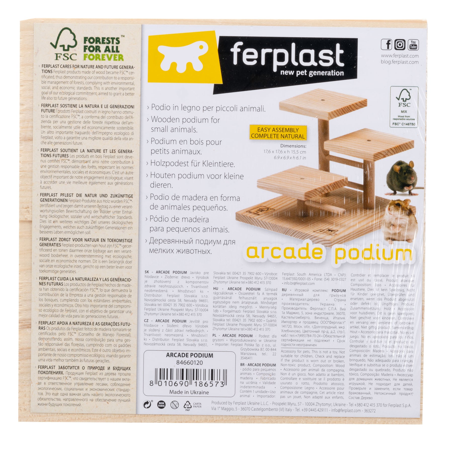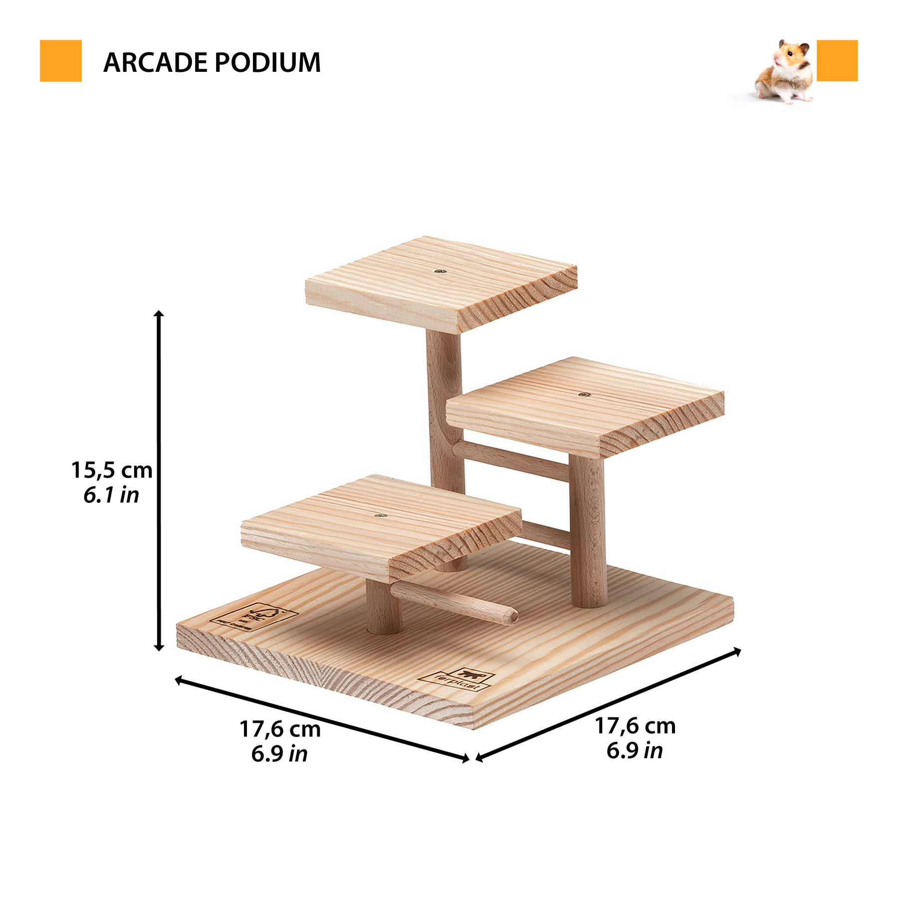 Arcade Podium, apto para hámsters y ratones, es un original pedestal de madera de 3 niveles equipado con plataformas, útiles para fomentar el ejercicio y el movimiento. Fácil de montar, se presenta en un práctico kit de montaje.