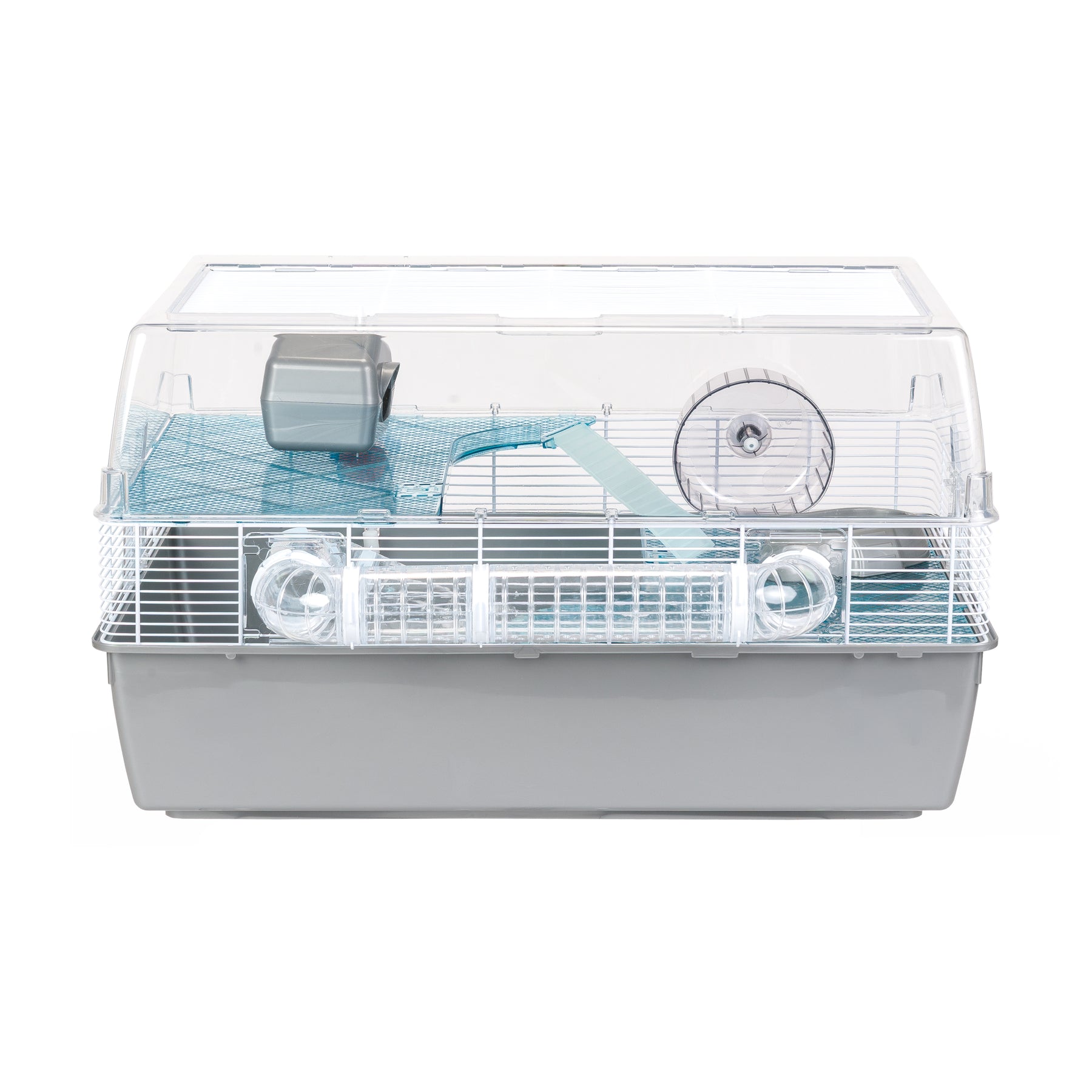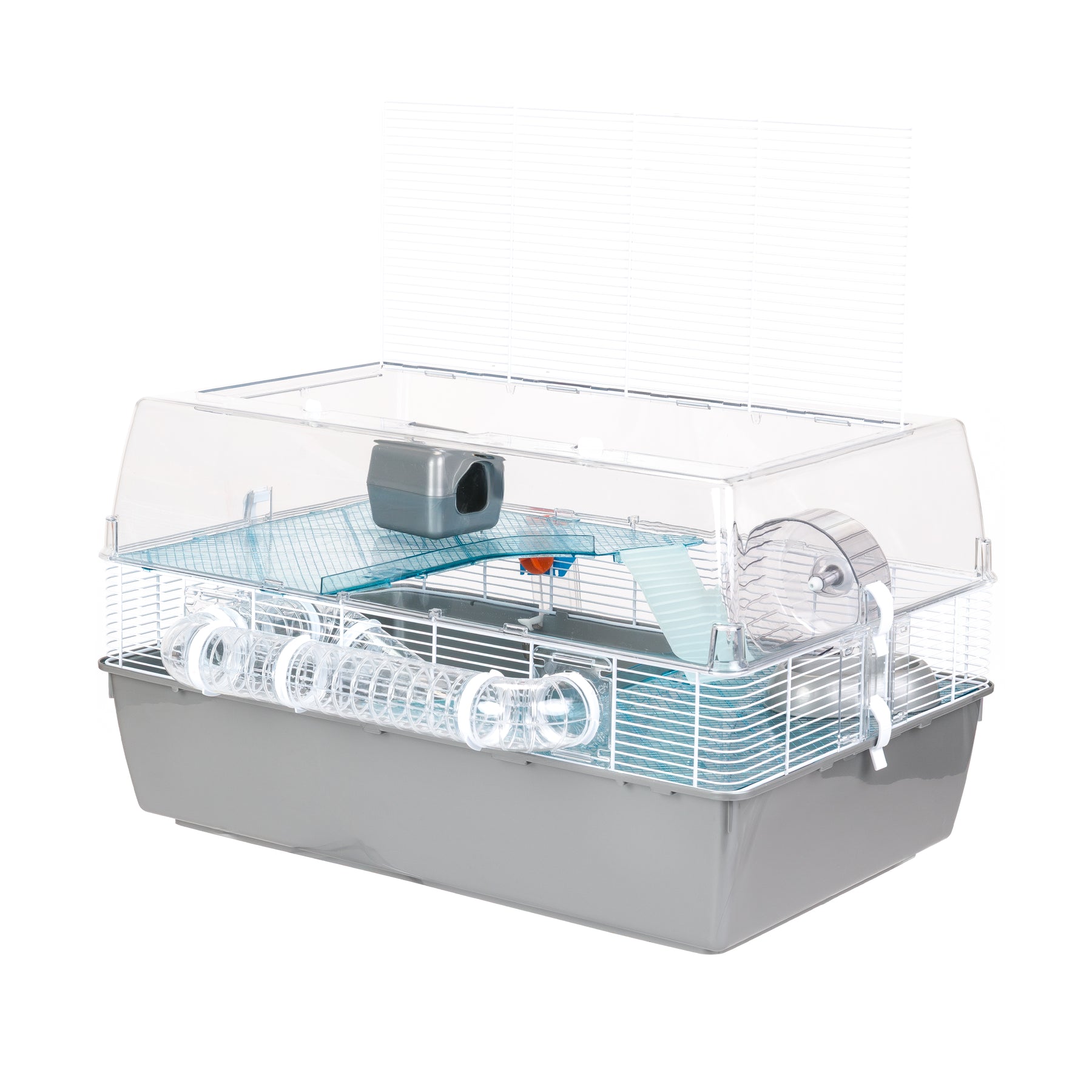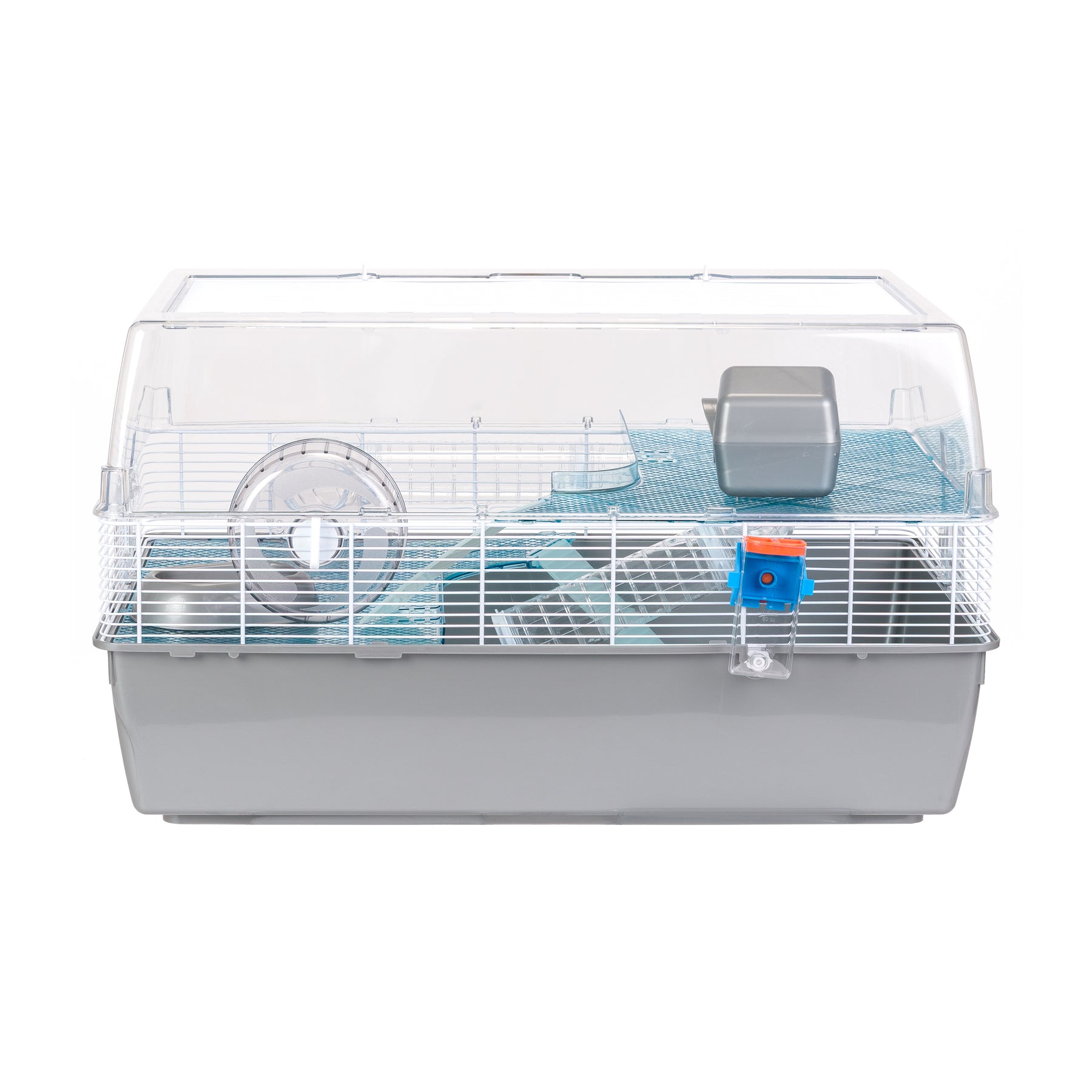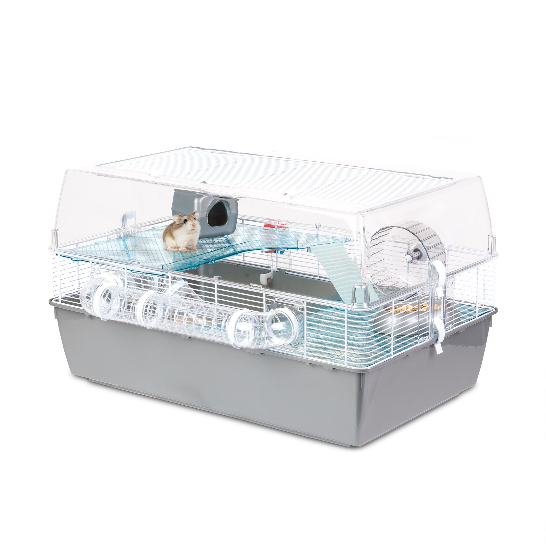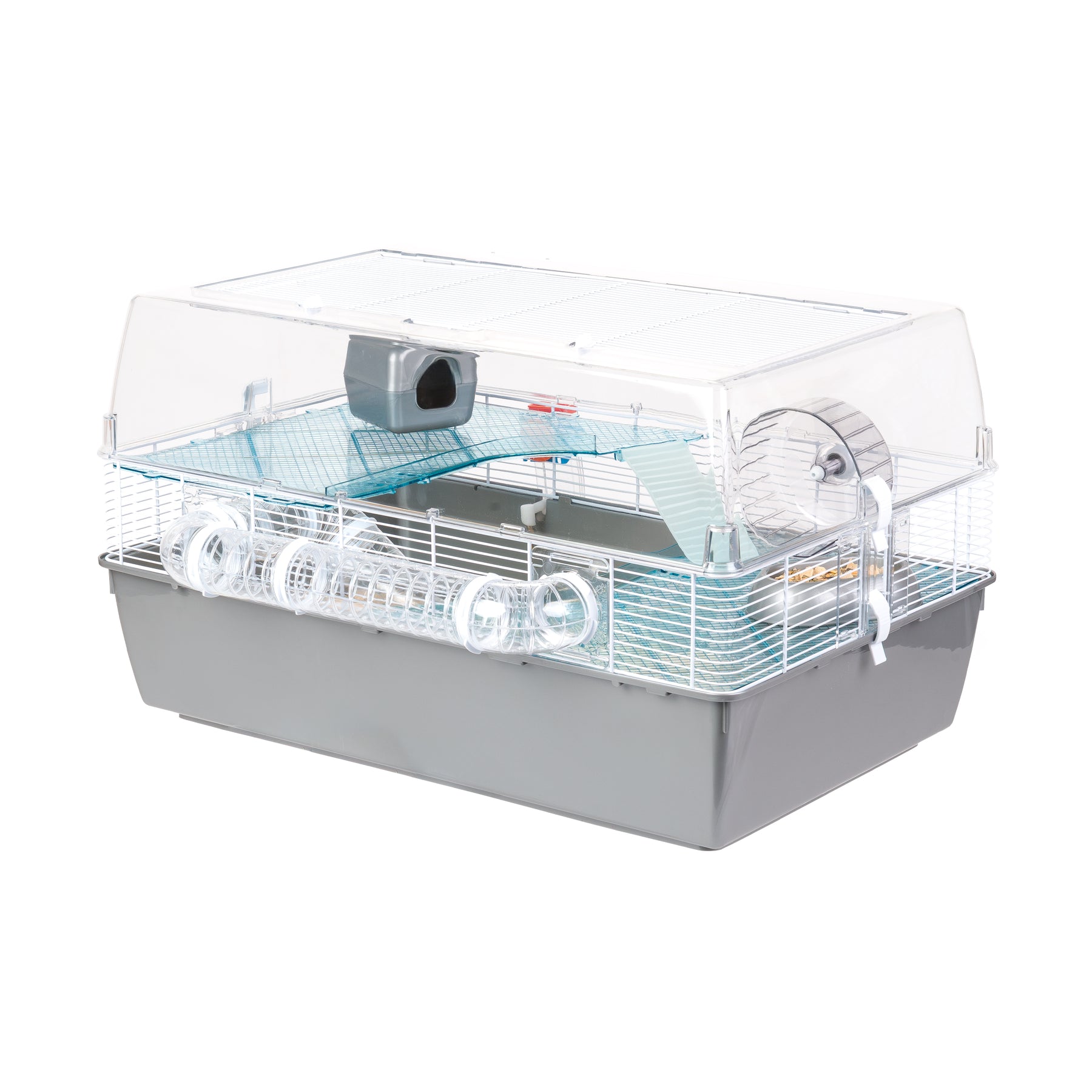 Duna Fun Large es una jaula del hámster de amplias dimensiones, equipada con base grande. Esta versión amplia consta de tres niveles que contienen todas las comodidades, incluyendo un nido, escaleras, una botella de bebida, una rueda y tubos transparentes, los accesorios imprescindibles para hacer que su amigo tenga diversión.