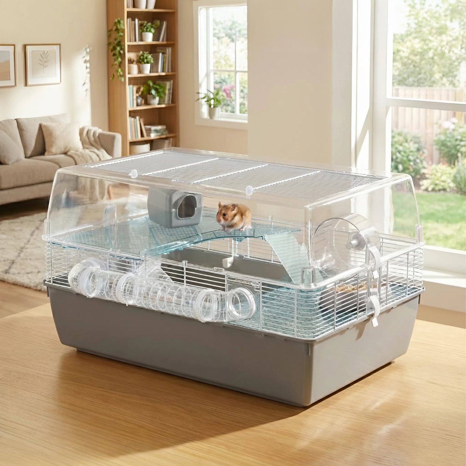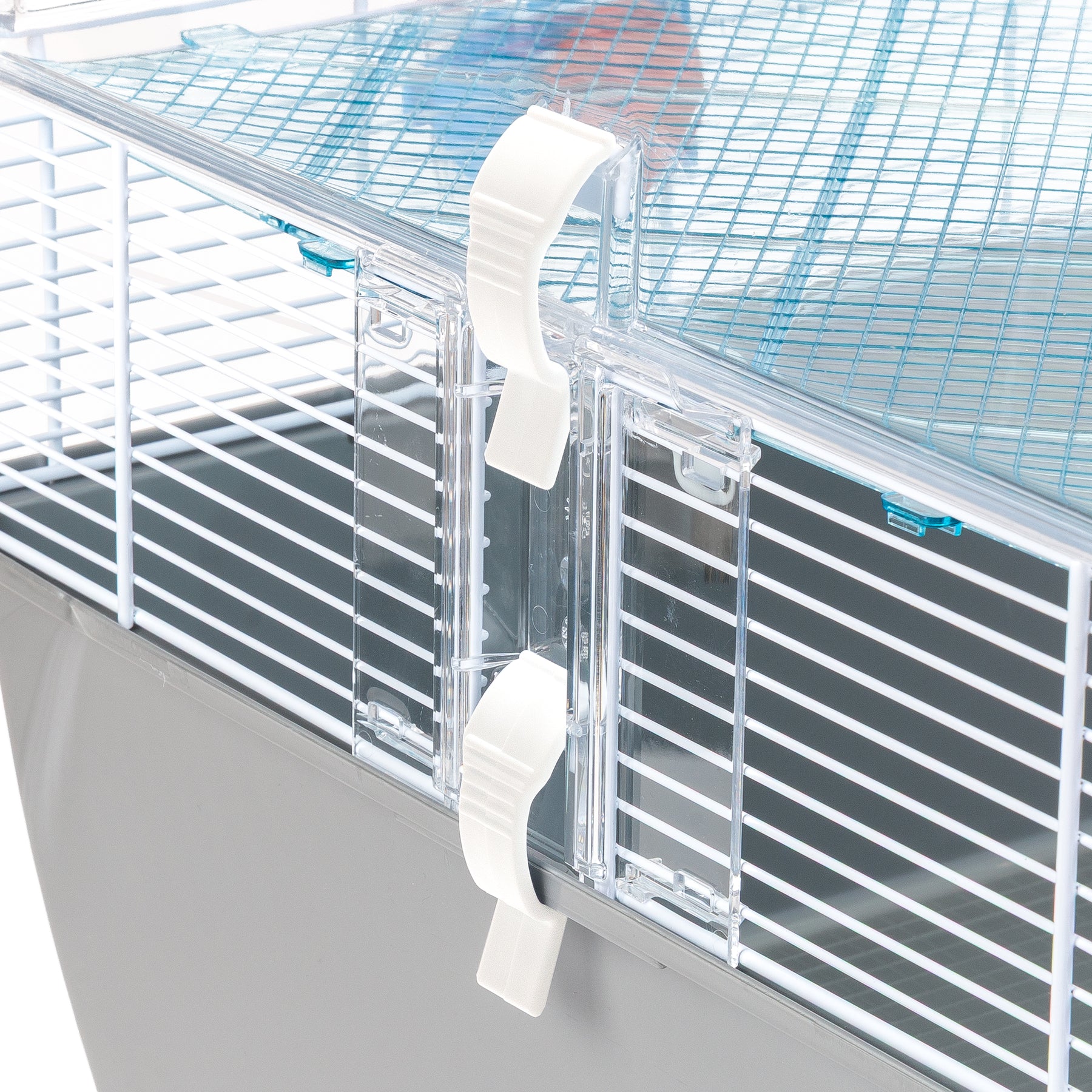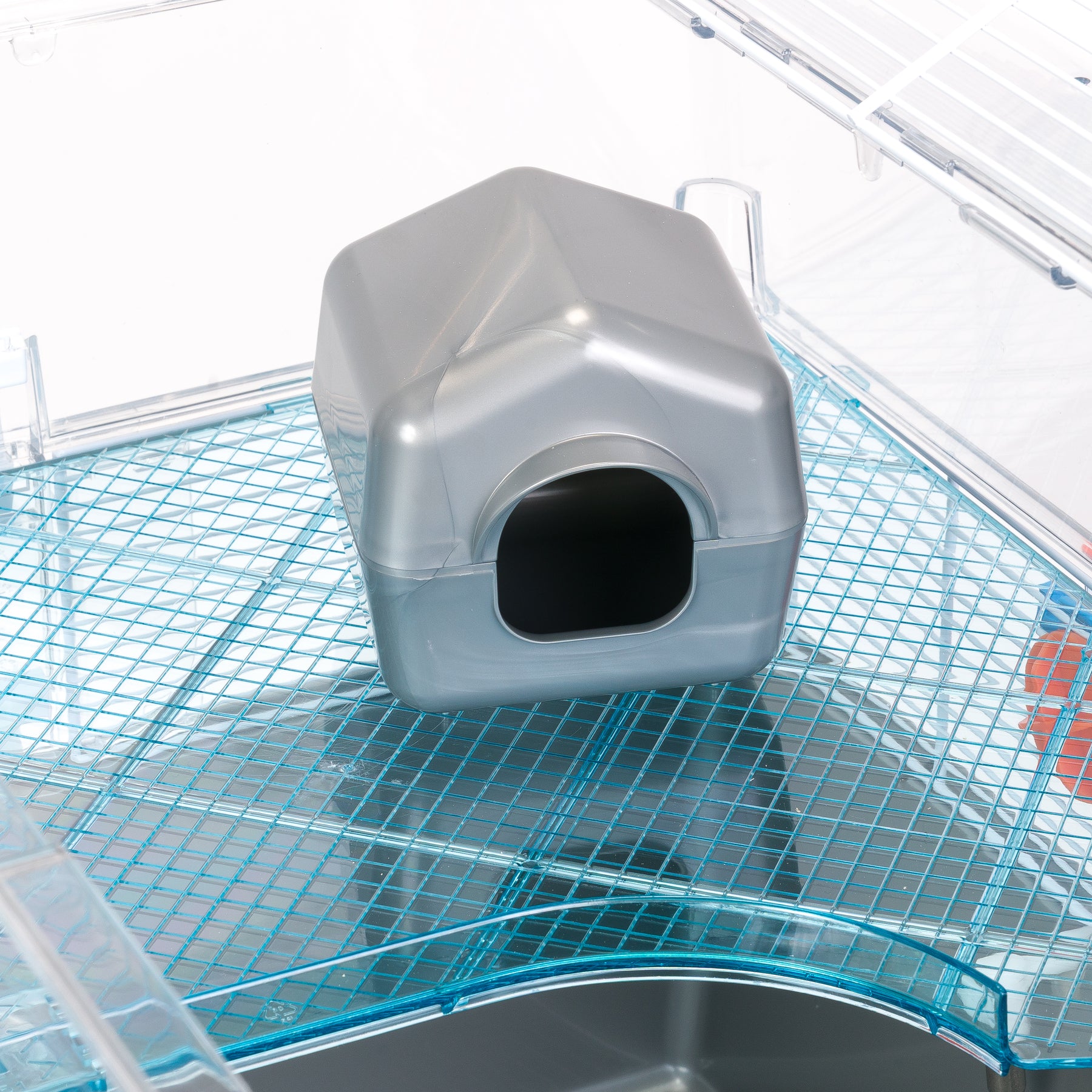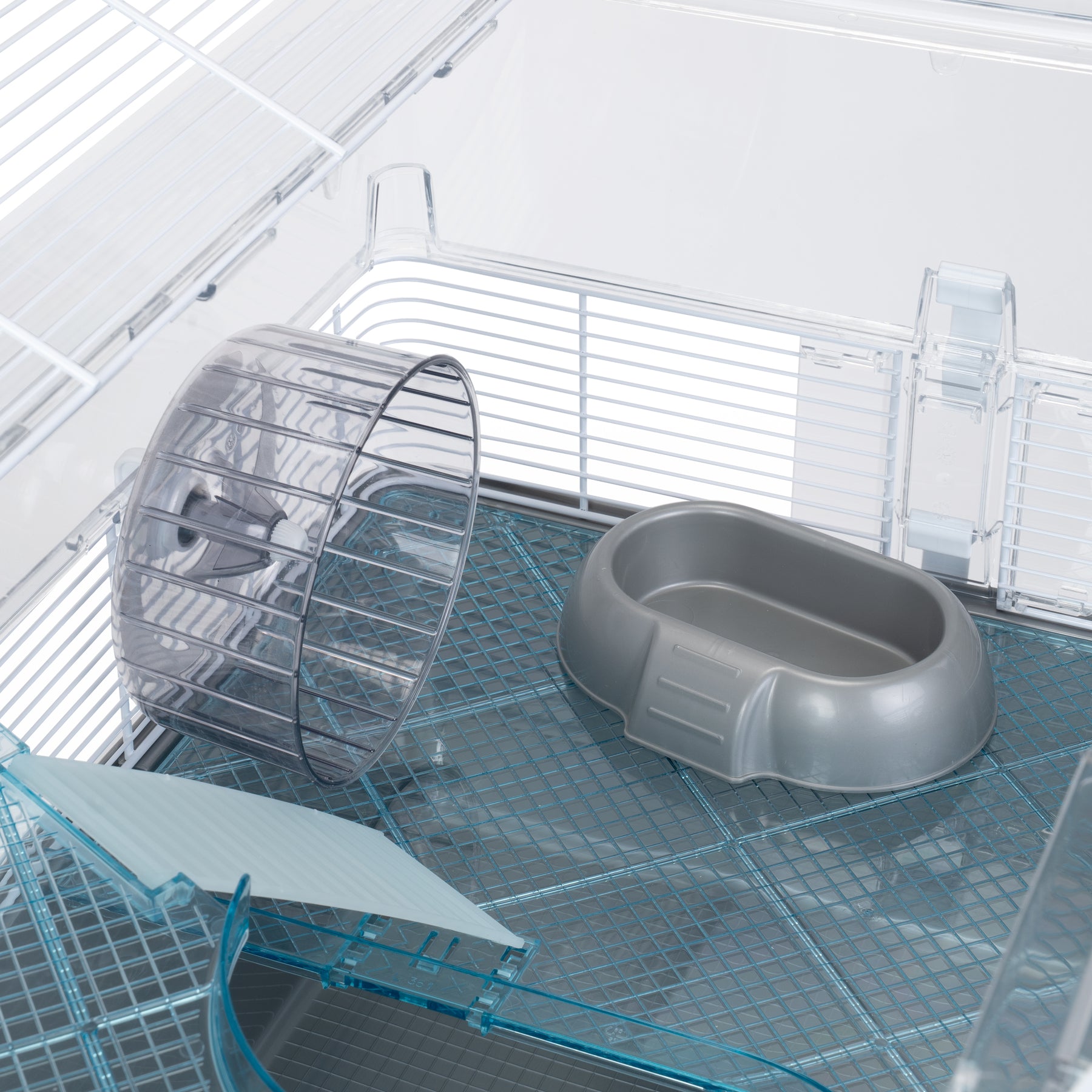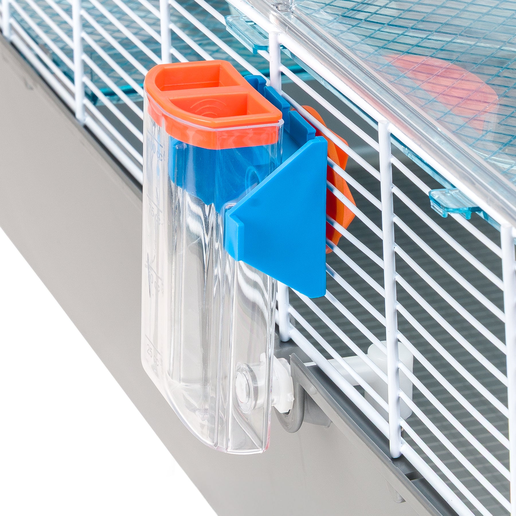 Duna Fun Large es una jaula del hámster de amplias dimensiones, equipada con base grande. Esta versión amplia consta de tres niveles que contienen todas las comodidades, incluyendo un nido, escaleras, una botella de bebida, una rueda y tubos transparentes, los accesorios imprescindibles para hacer que su amigo tenga diversión.