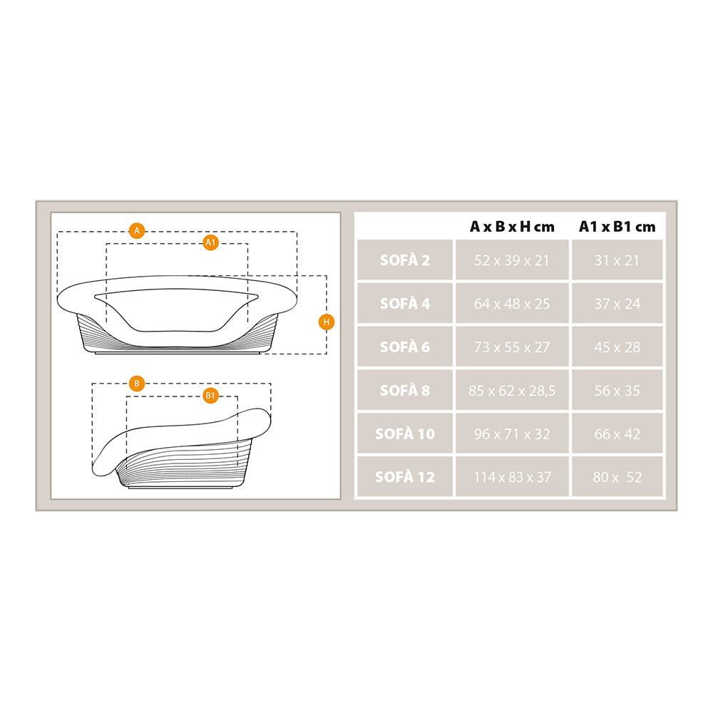 Las camas Sofà están disponibles en seis tamaños y en tres diferentes patrones de color, para amoldarse a tus necesidades. Para gatos, recomendamos los tamaños más pequeños, Sofà 2, 4 y 6, en cambio para perros todos los tamaños son adecuados.