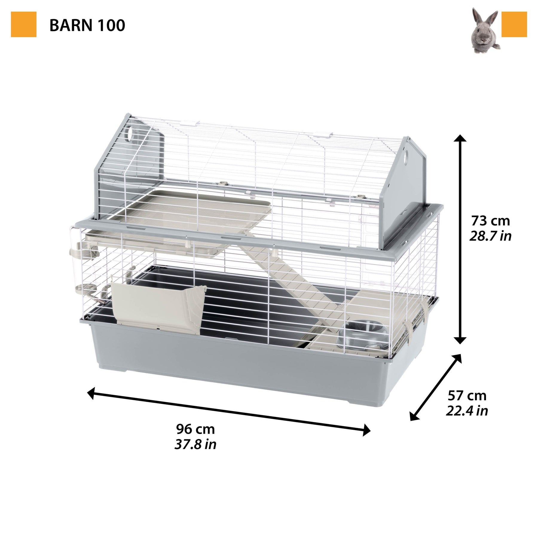 Barn 100 nos recuerda un granero americano gracias a su forma con techo realzado. Cómoda y espaciosa, esta jaula para conejos presenta una amplia superficie transitable: el piso inferior presenta una cómoda casita, perfecta para momentos de descanso, y una escalerita de plástico lleva hacia el piso superior donde se encuentra un área ulterior para su mascota. El hábitat está equipado con los accesorios indispensables como comedero, cuenco y bebedero.