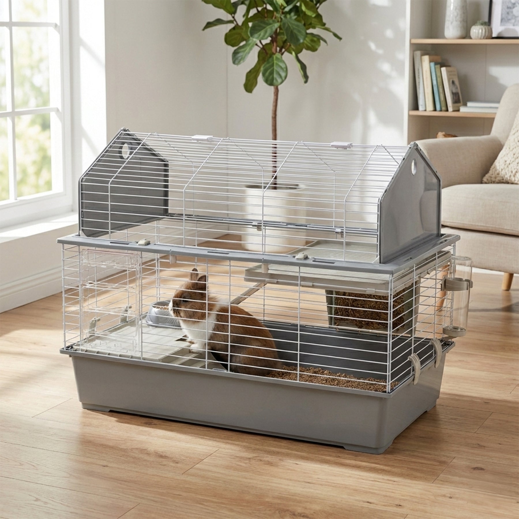 - Una rampa conveniente conecta la casa de los conejos con el piso superior