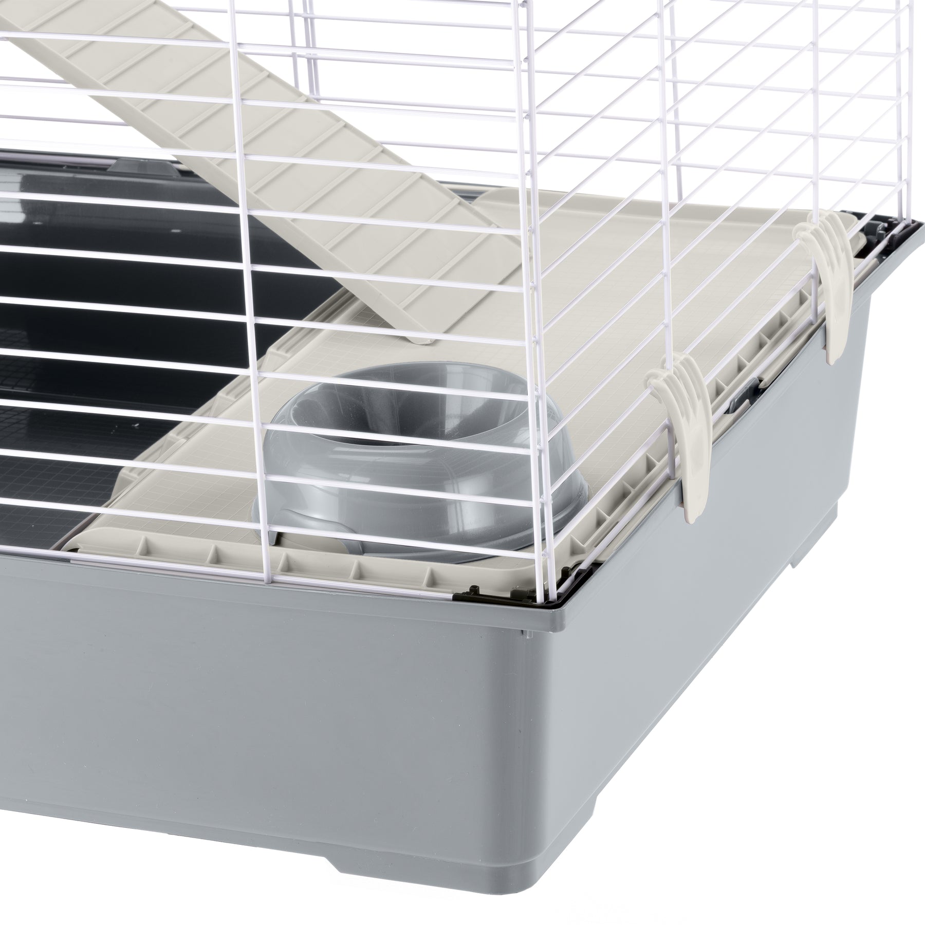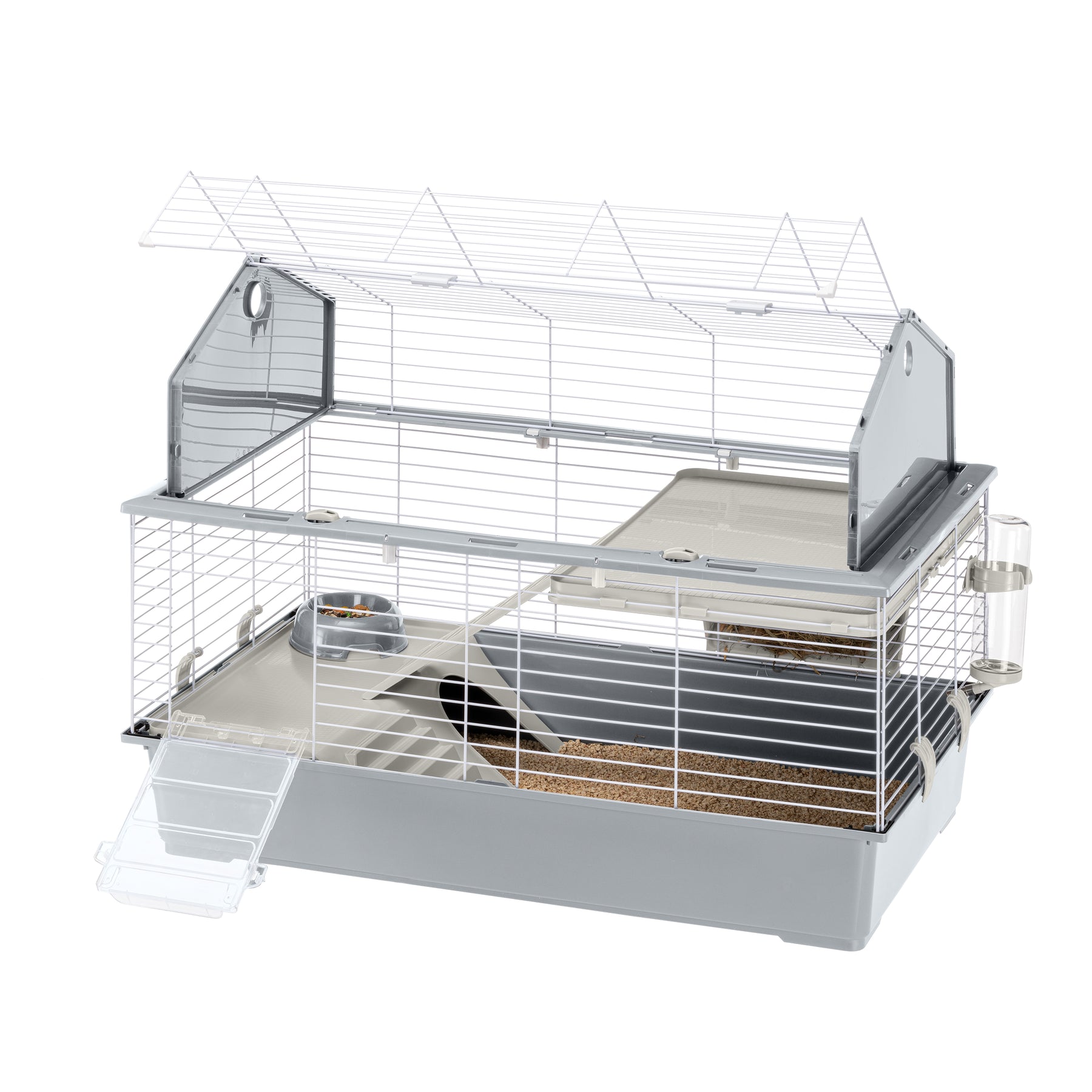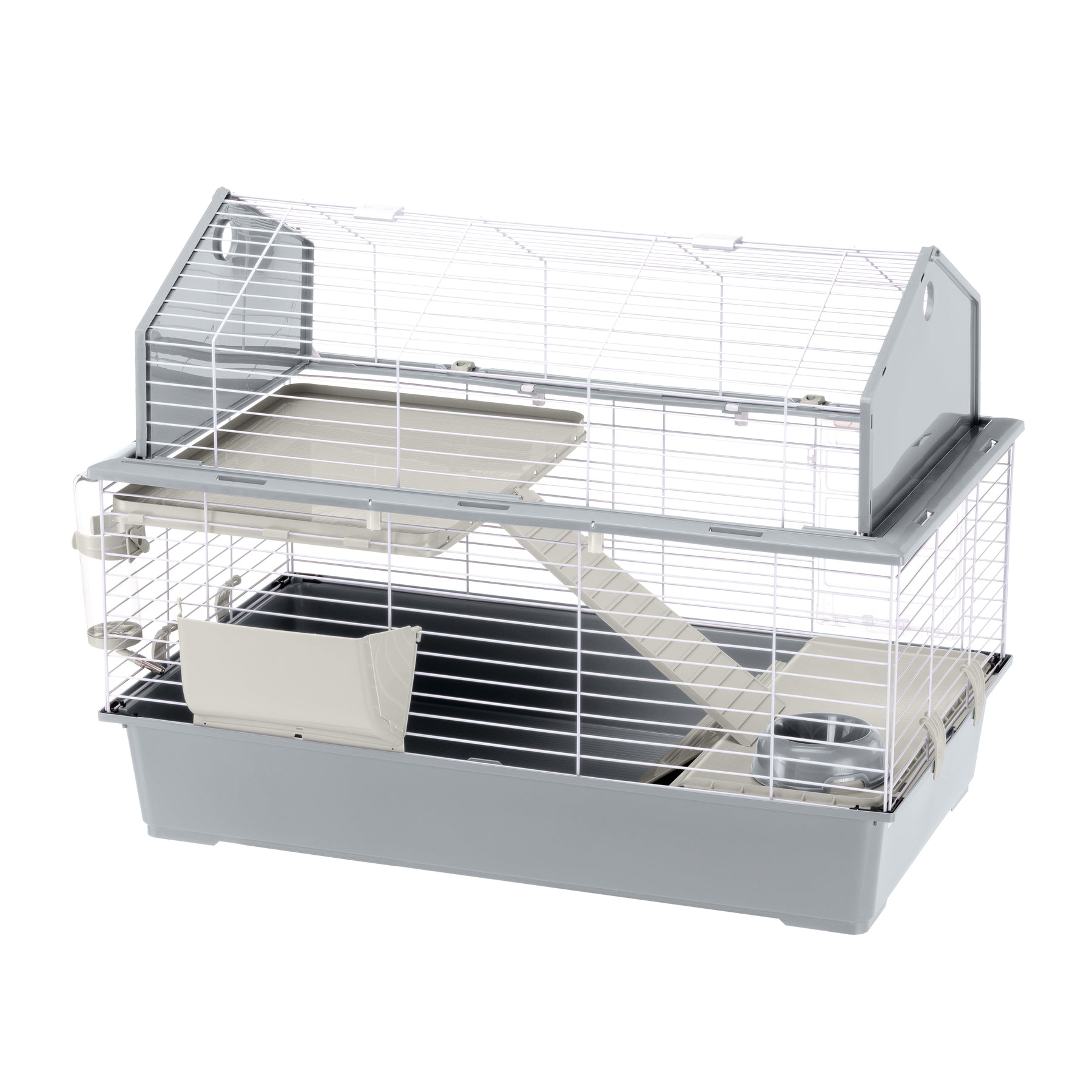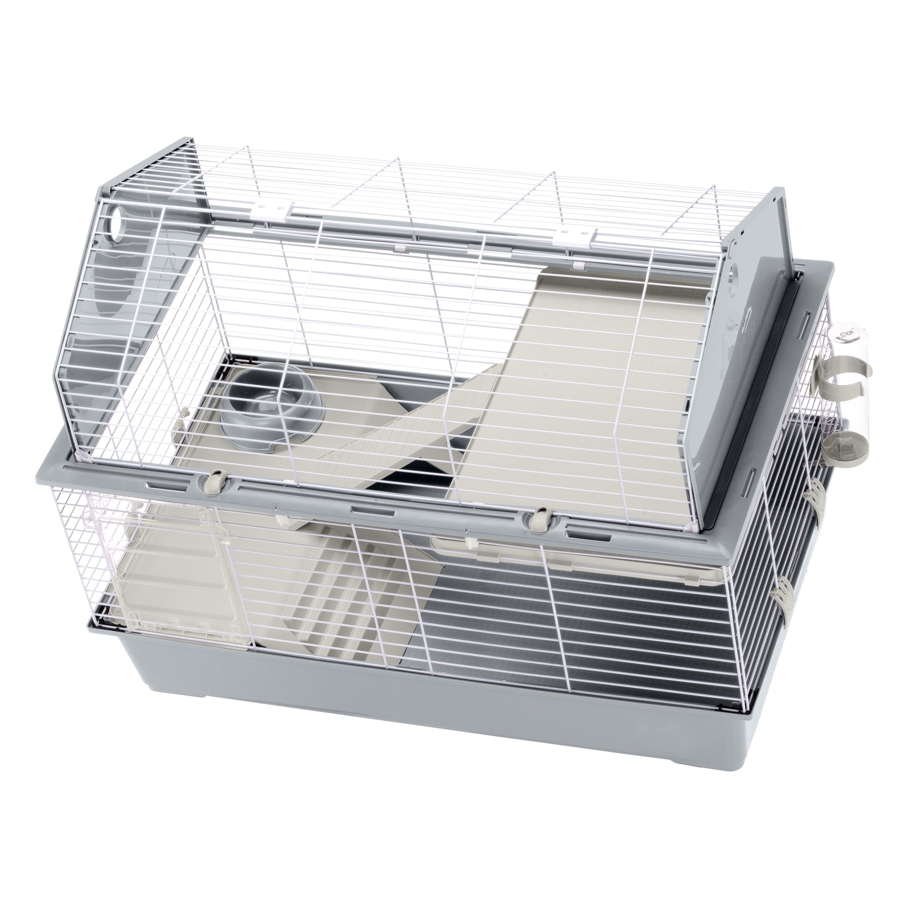 La jaula, completamente desmontable, mantiene un volumen reducido y ha sido realizada con robusta rejilla metálica pintada, con base de resina termo plástica para contener eficazmente la suciedad, la arena y los residuos de comida. En la parte delantera ha sido predispuesta una cómoda escalera que permite al pequeño animal salir y entrar de forma independiente.