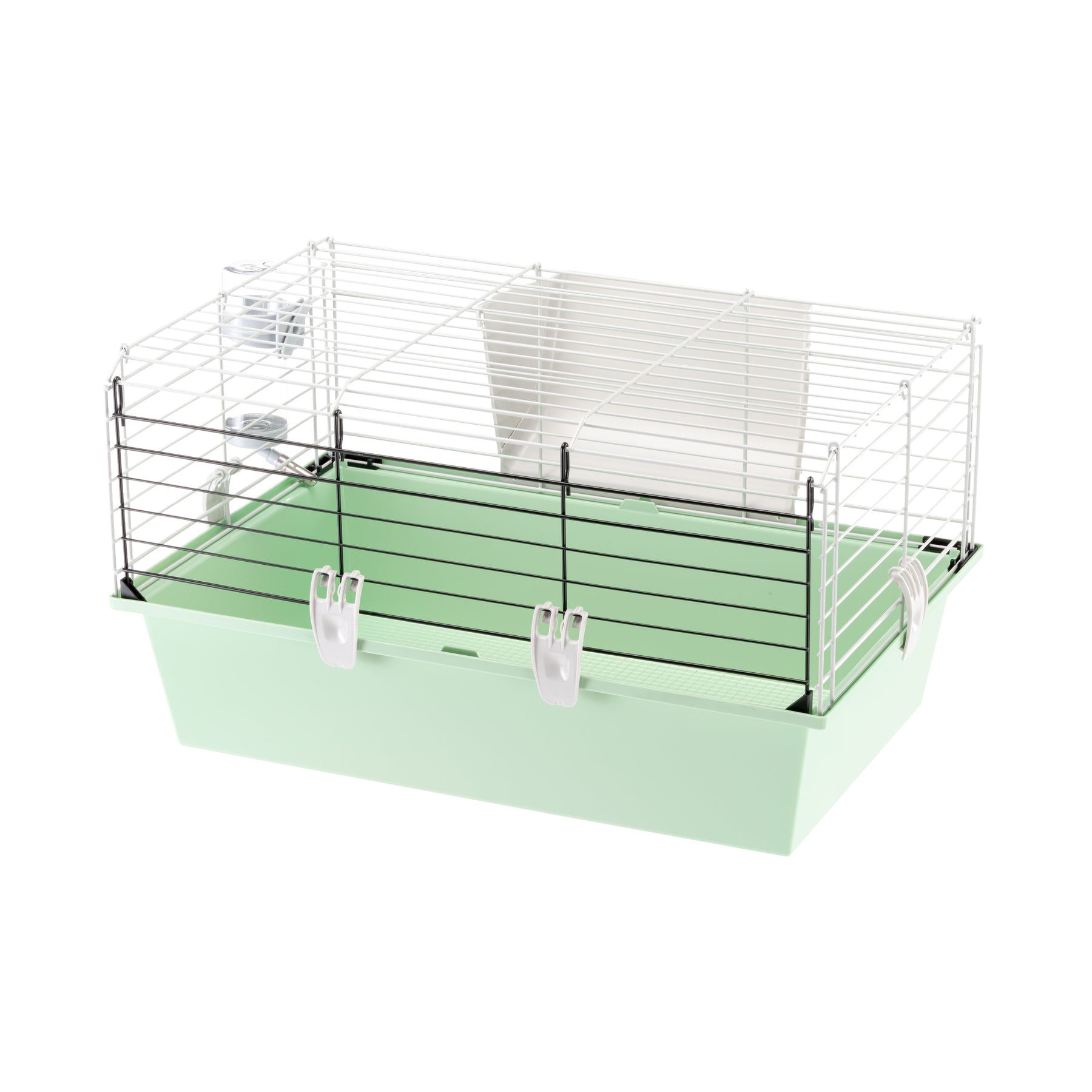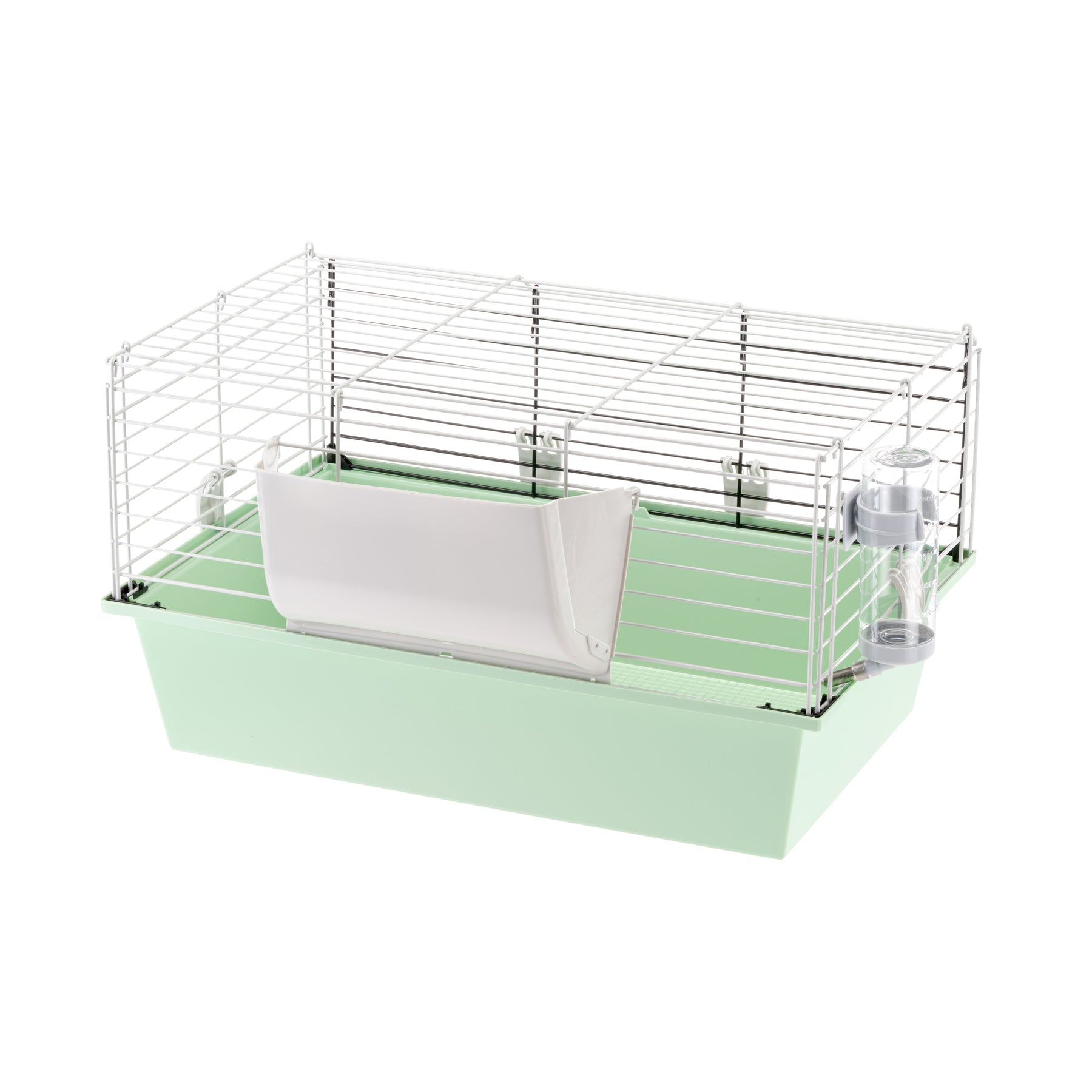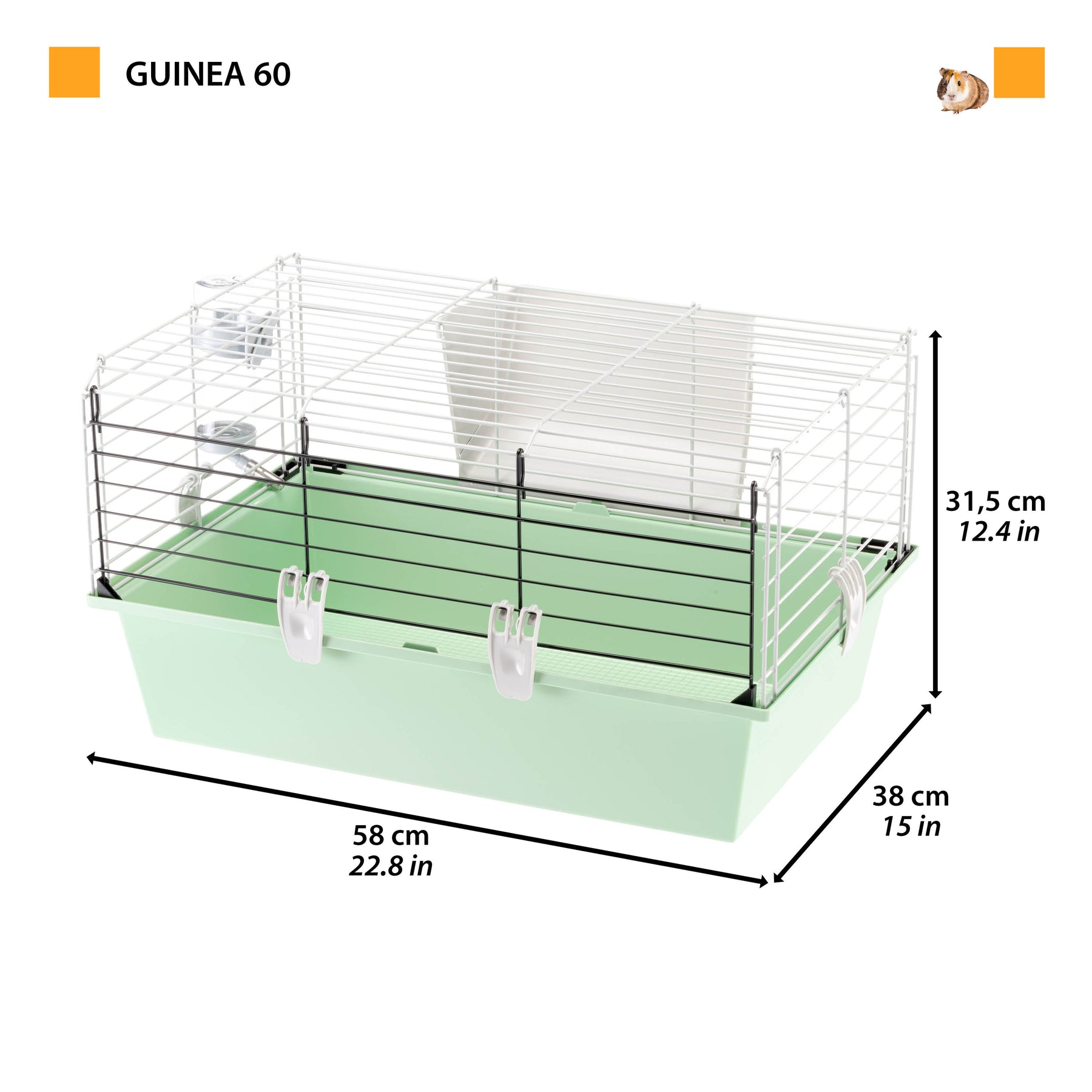 Guinea 60 es una jaula de conejillo de Indias con un reciente renovado sistema de apertura y cierre, garantizando total seguridad para sus mascotas. El hábitat tiene una estructura tradicional con una base de plástico y una estructura de malla de alambre barnizado. En la parte frontal, la puerta puede abrirse completamente, para facilitar la limpieza. Dentro, encontrará accesorios, incluyendo un bebedero y un alimentador plástico para heno. Guinea 60 es un producto ecológico de la gama “ahorro de espacio”. Se vende en un paquete de ahorro de espacio y puede desmontarse completamente.