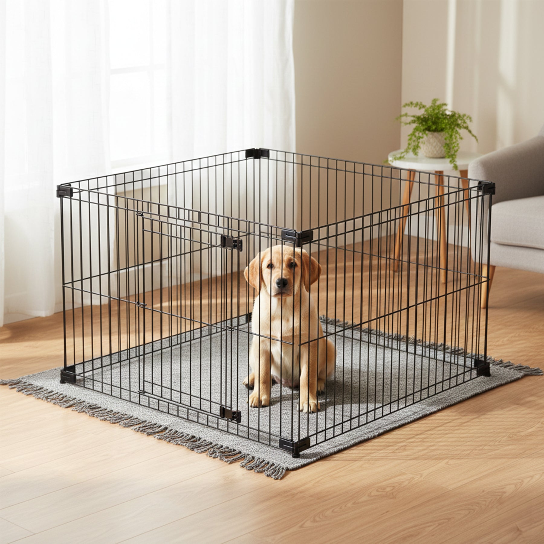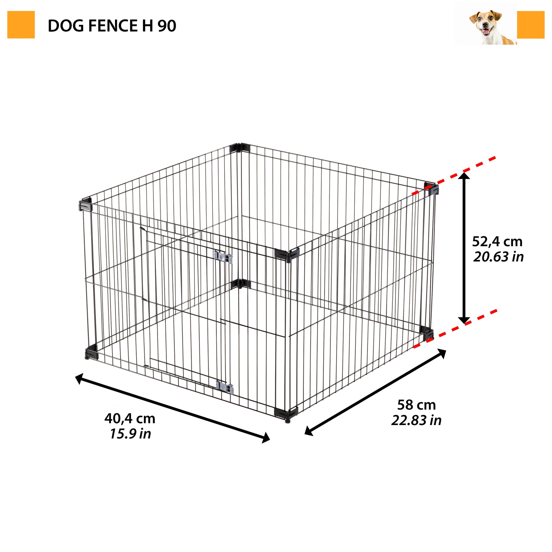 DOG FENCE es un parque modular para perros diseñado para ofrecer un espacio seguro, protegido y totalmente adaptable tanto en interiores como en exteriores. Fabricado en metal resistente con recubrimiento plástico, proporciona gran estabilidad, larga durabilidad y un diseño discreto que se integra fácilmente en el hogar o el jardín. La gama se compone de tres versiones: el modelo de 4 paneles con 90 cm de altura, ideal para quienes necesitan una barrera más alta; el de 6 paneles con 60 cm; y el de 8 paneles, también con 60 cm de altura, perfecto para crear un área amplia destinada al juego o al reposo del perro.