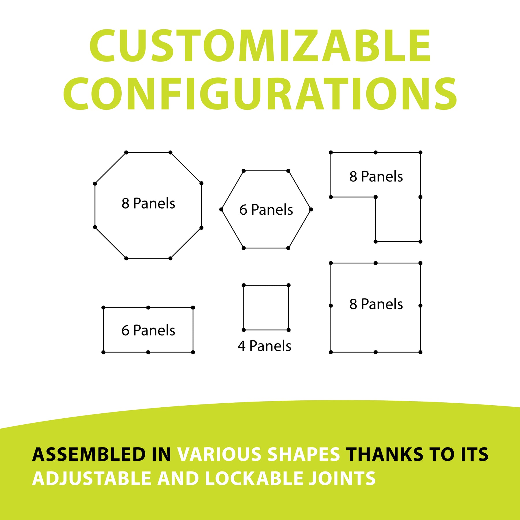 Las uniones ajustables y bloqueables permiten configurar el cercado de acuerdo con el espacio disponible, adoptando formas cuadradas, rectangulares, poligonales o completamente personalizadas. Las patas antideslizantes aseguran una excelente estabilidad sobre diferentes superficies, mientras que la puerta con cierre de seguridad garantiza un acceso cómodo y perfectamente controlado. Su montaje no requiere herramientas, lo que convierte DOG FENCE en una solución práctica tanto para un uso diario como ocasional.