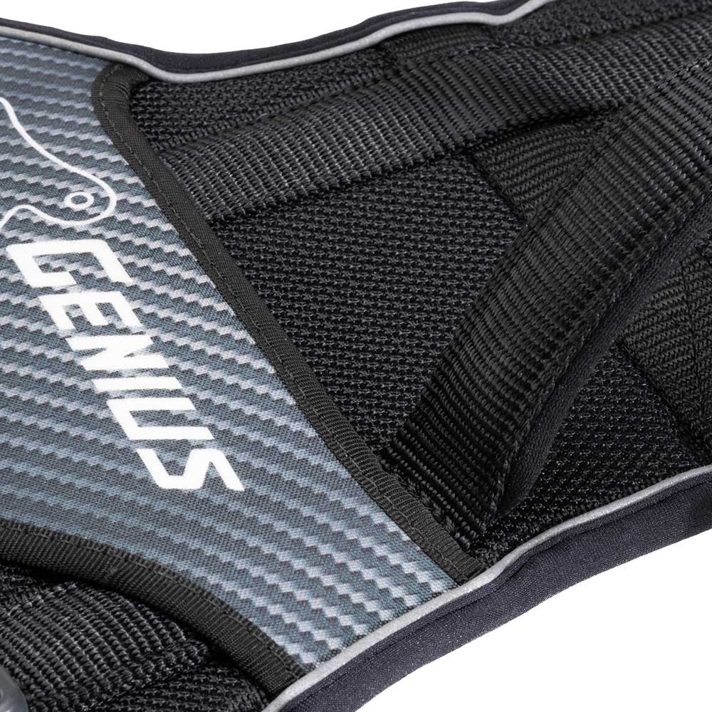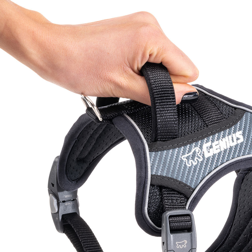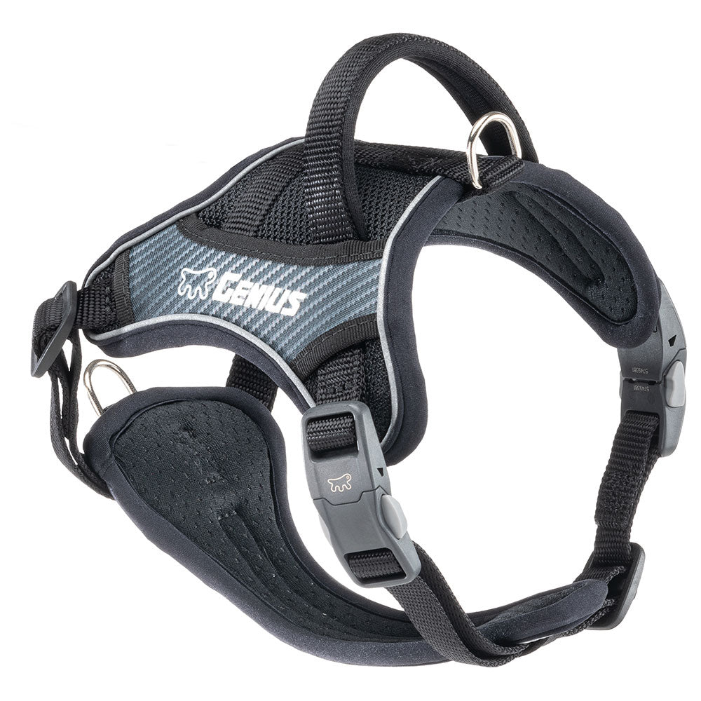 El arnés para perros Genius está fabricado en nylon resistente, diseñado para durar en el tiempo y aguantar bien el estrés del animal. Forrado con un suave acolchado, que transpira en contacto con el cuerpo del perro, garantiza el máximo confort a tu amigo de cuatro patas, y se adapta fácilmente a su cuerpo, vistiéndolo perfectamente. Ideal para salidas nocturnas, cuenta con útiles bordes reflectantes para garantizar la máxima seguridad y visibilidad. El práctico asa en la espalda le permite controlar eficazmente al animal, es conveniente ayudarlo a superar obstáculos particularmente difíciles.