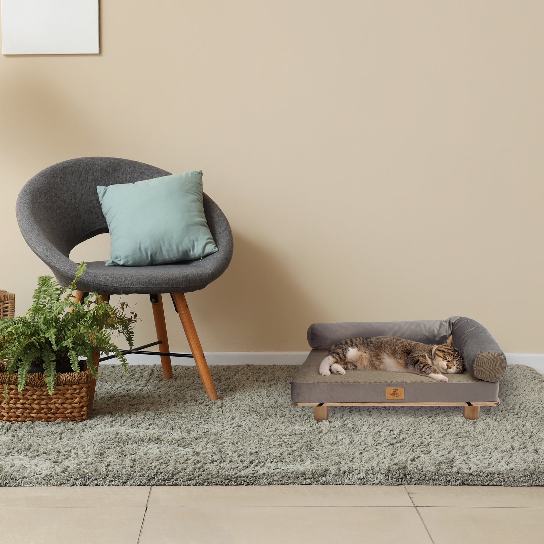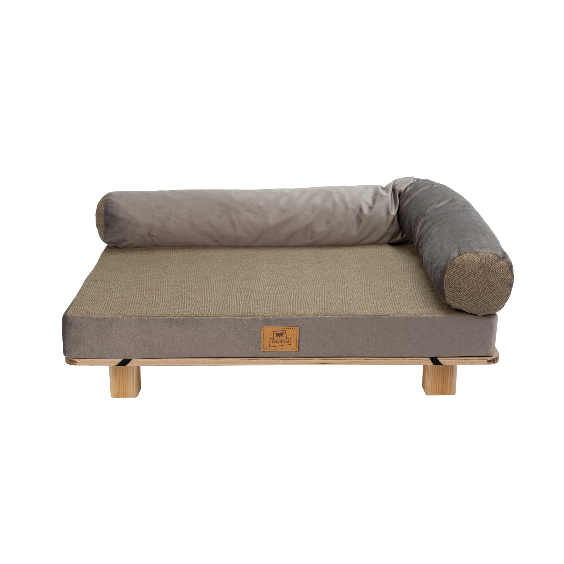 El colchón está realizado en tweed de alta calidad con elegantes detalles de terciopelo en tonos marrones. Su relleno es suave pero con un soporte adecuado, mientras que el rulo acolchado actúa como respaldo y reposacabezas, ofreciendo una postura de descanso relajada y natural. El colchón es lavable a 30 °C, facilitando la higiene diaria.