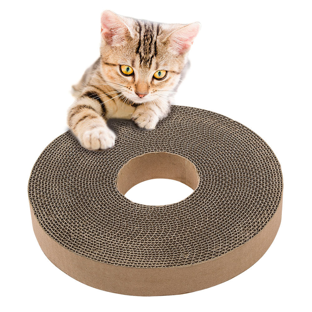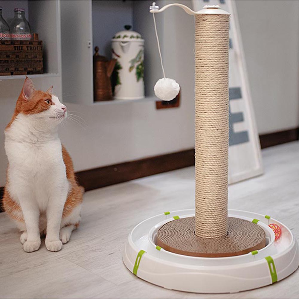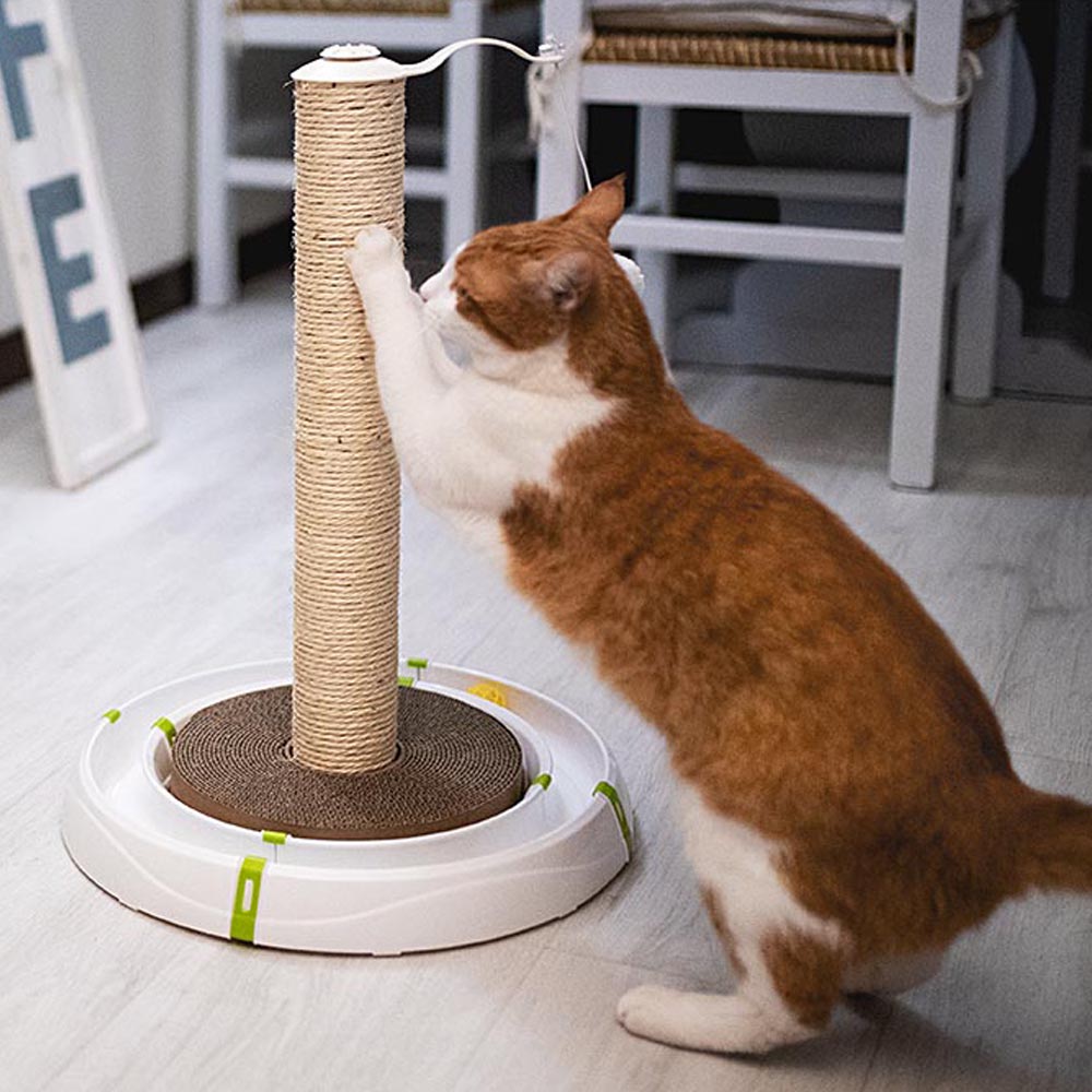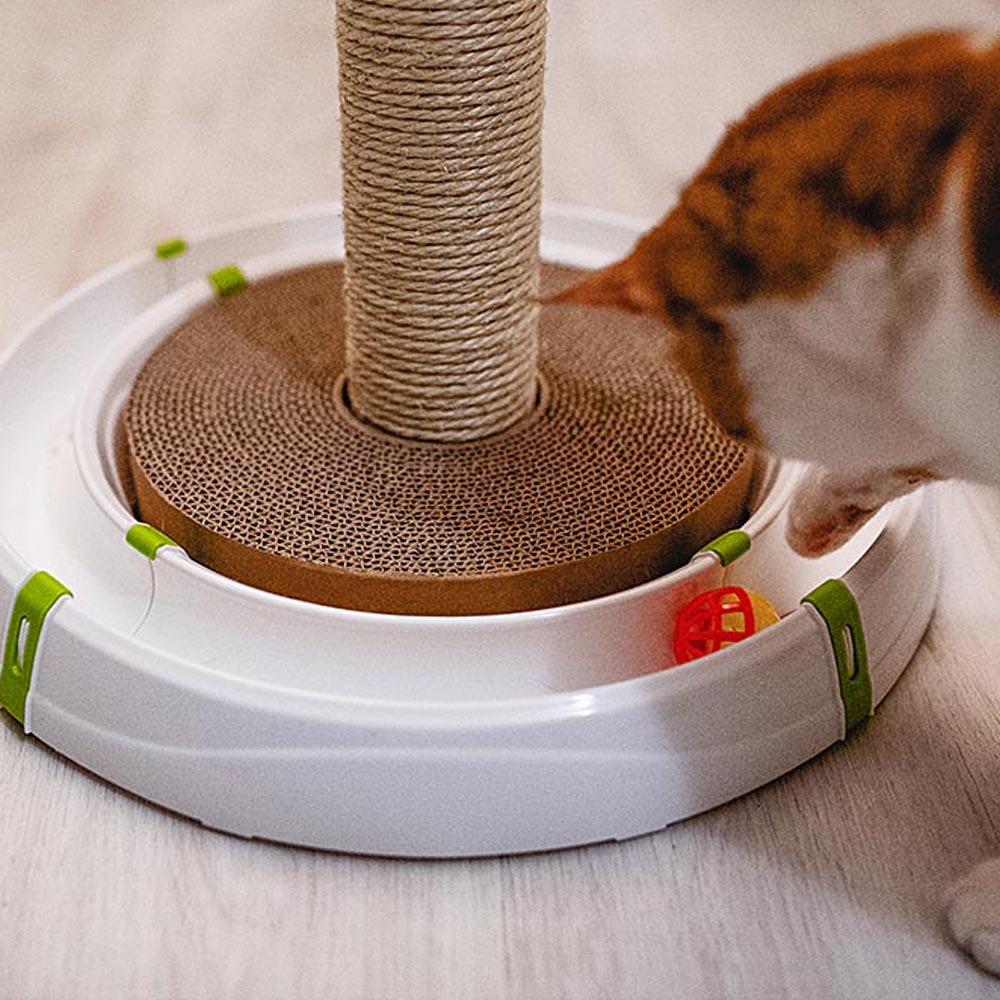 Este juego multifuncional para gatos consiste en un circuito de plástico con una columna central de sisal robusto y una zona rascador de cartón especial que permitirá al gato limarse las uñas sin arañar los muebles, cortinas o tapizados.
