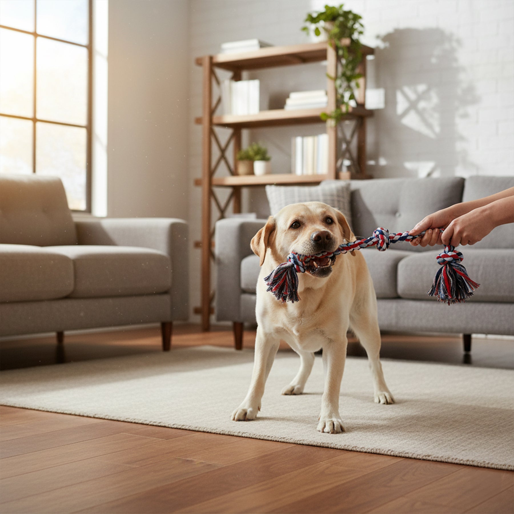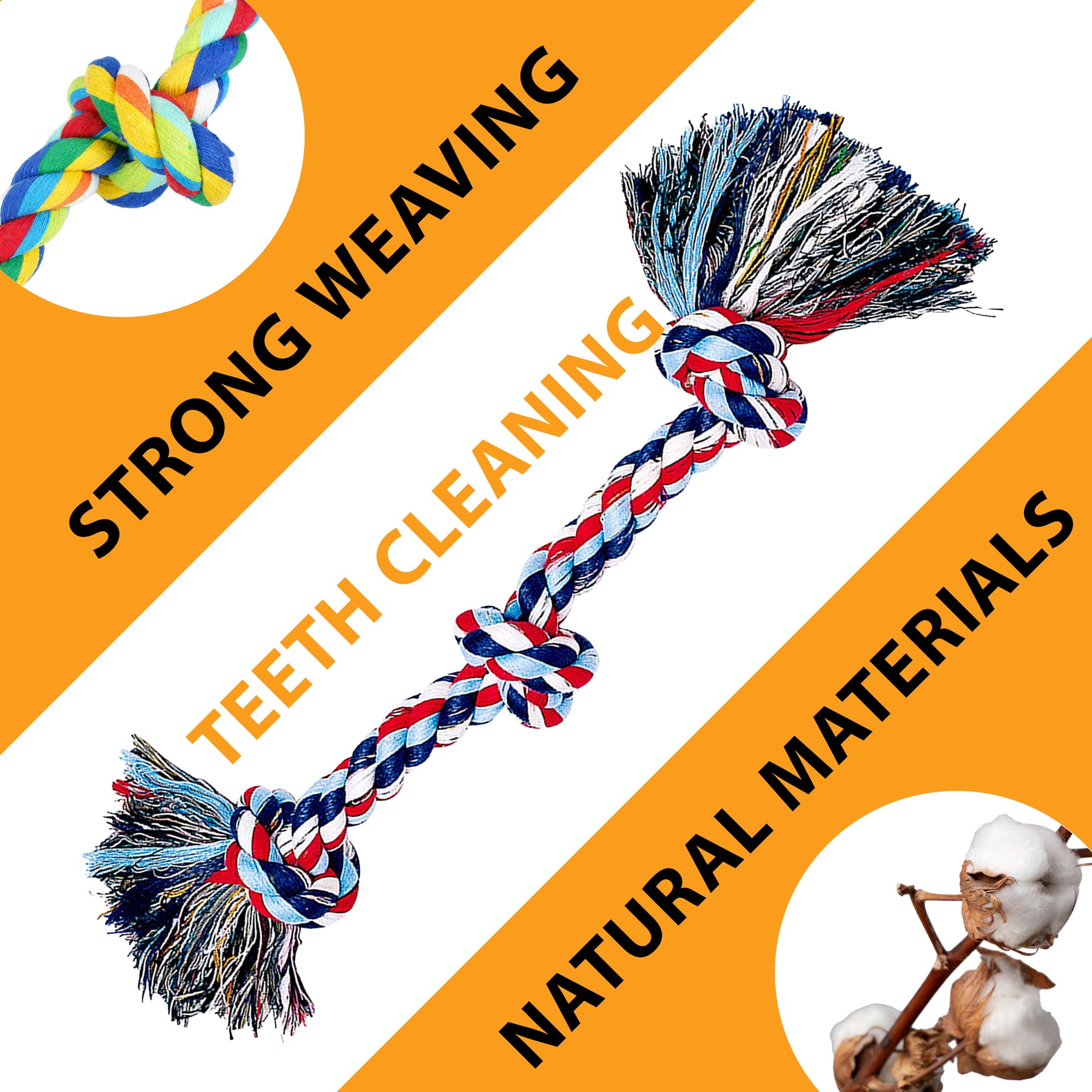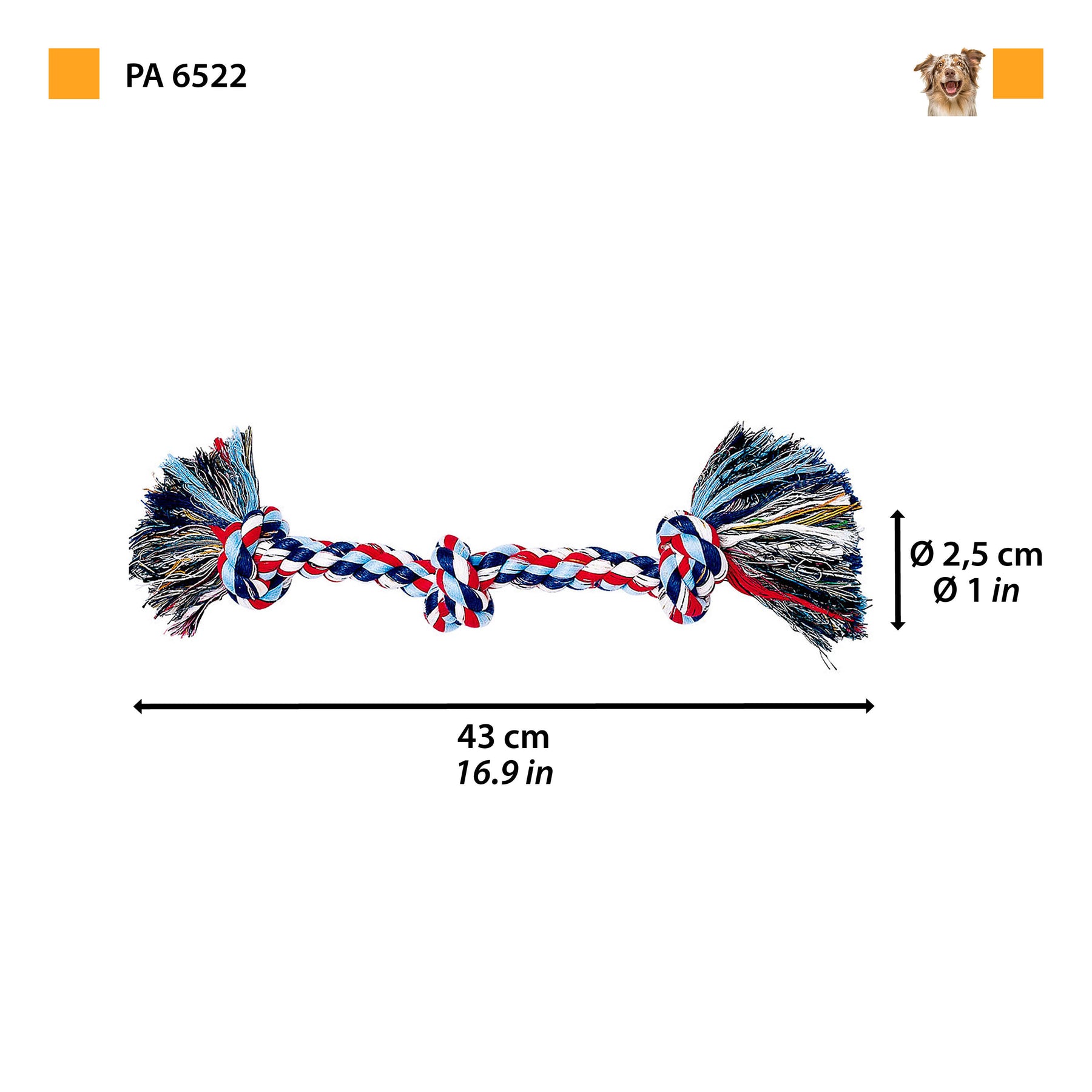 Este juguete para perros hecho de algodón trenzado con un nudo central y nudos a los lados divertirá a tu perro cuando intente quitártelo. Este es un juguete para perros hecho de algodón trenzado con nudos a los lados que tu perro se divertirá intentando coger. Los juguetes de algodón para perro como este son una buena opción para suplir a los clásicos juguetes de goma y látex. Perfecto para asegurar un buen rato a tu mascota!