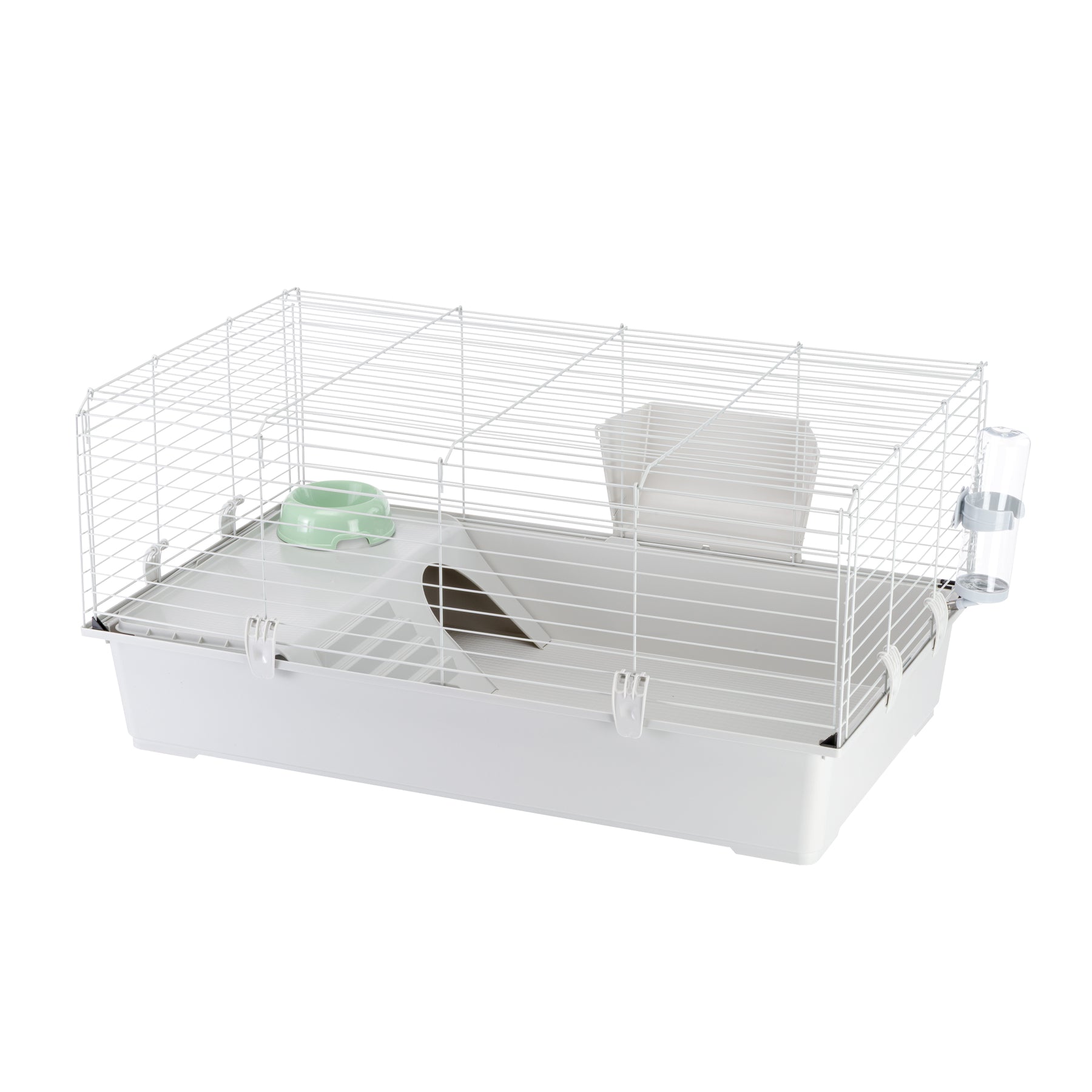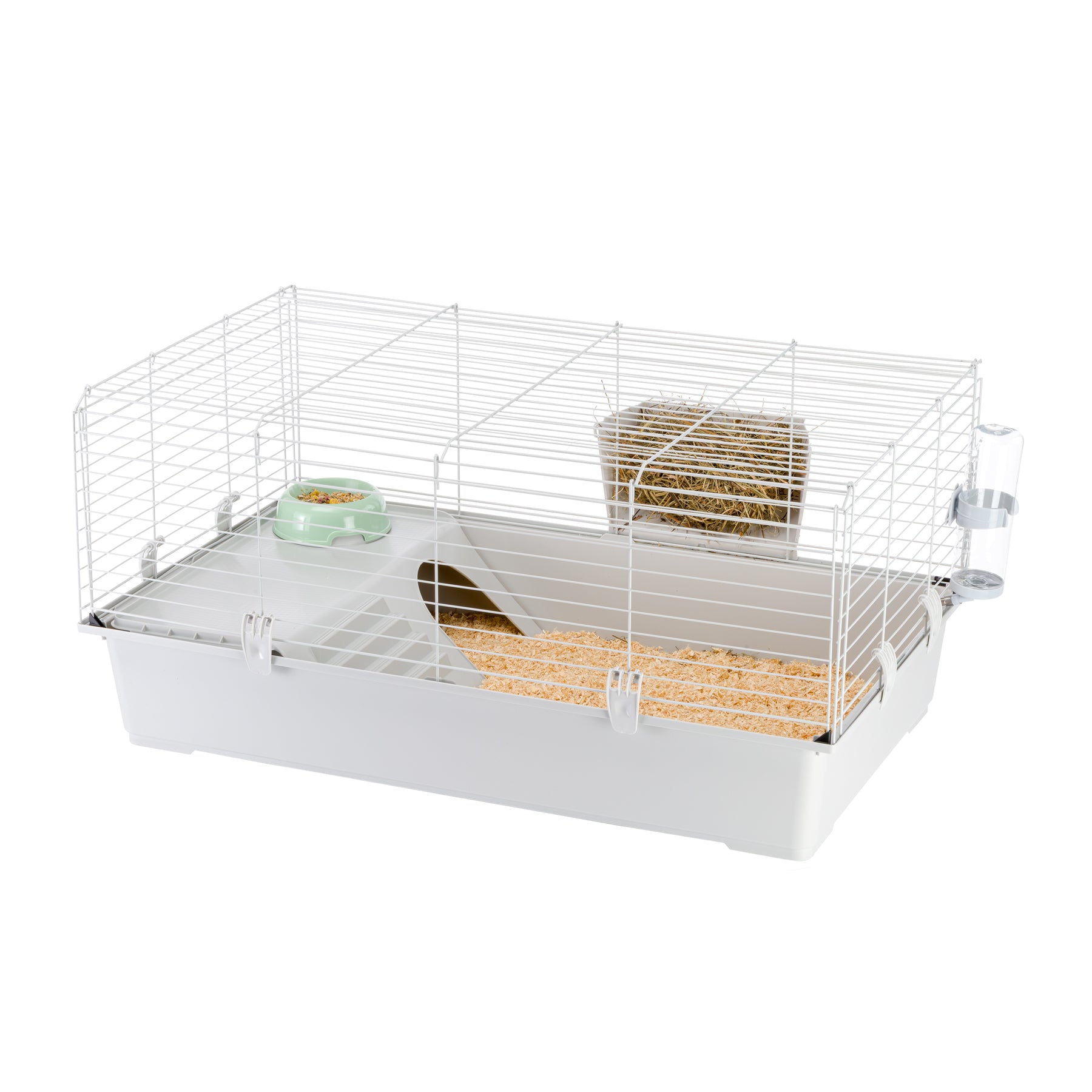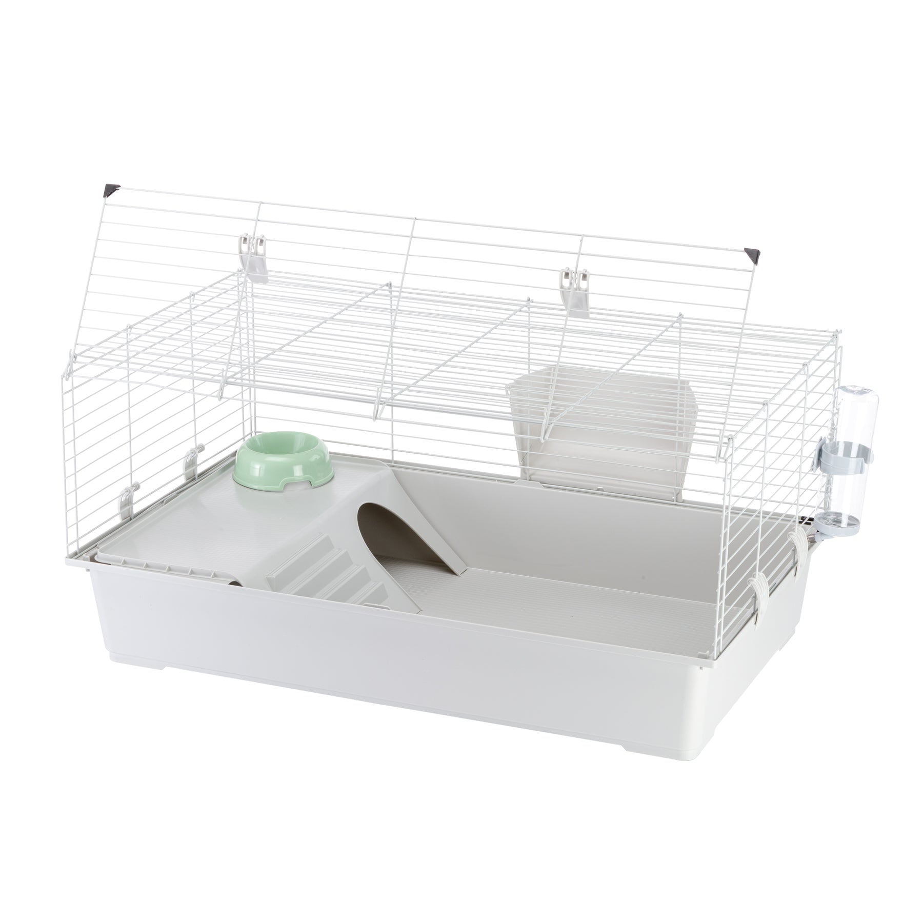 La jaula para conejos y conejillos de Indias Rabbit 100 es muy amplia y está dotada con todos los accesorios indispensables a tu mascota: un recipiente de plástico para el heno, un bebedero, un comedero y una casita para el reposo, todo fabricado en plástico.