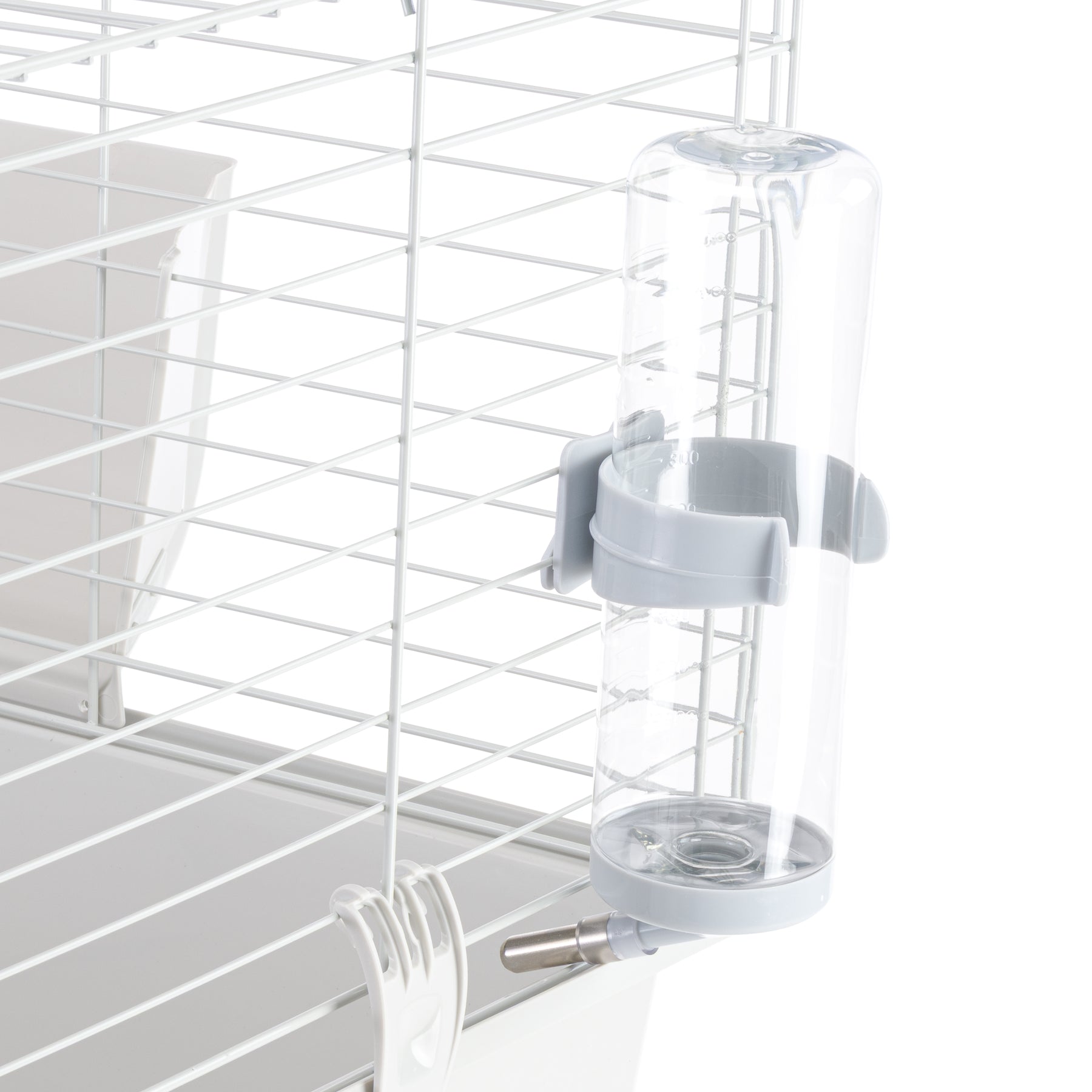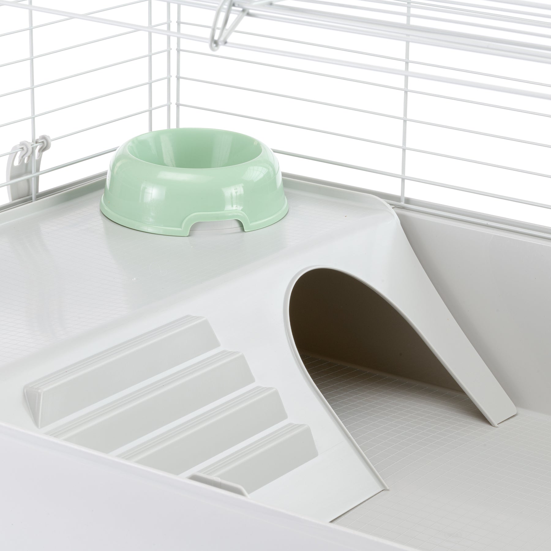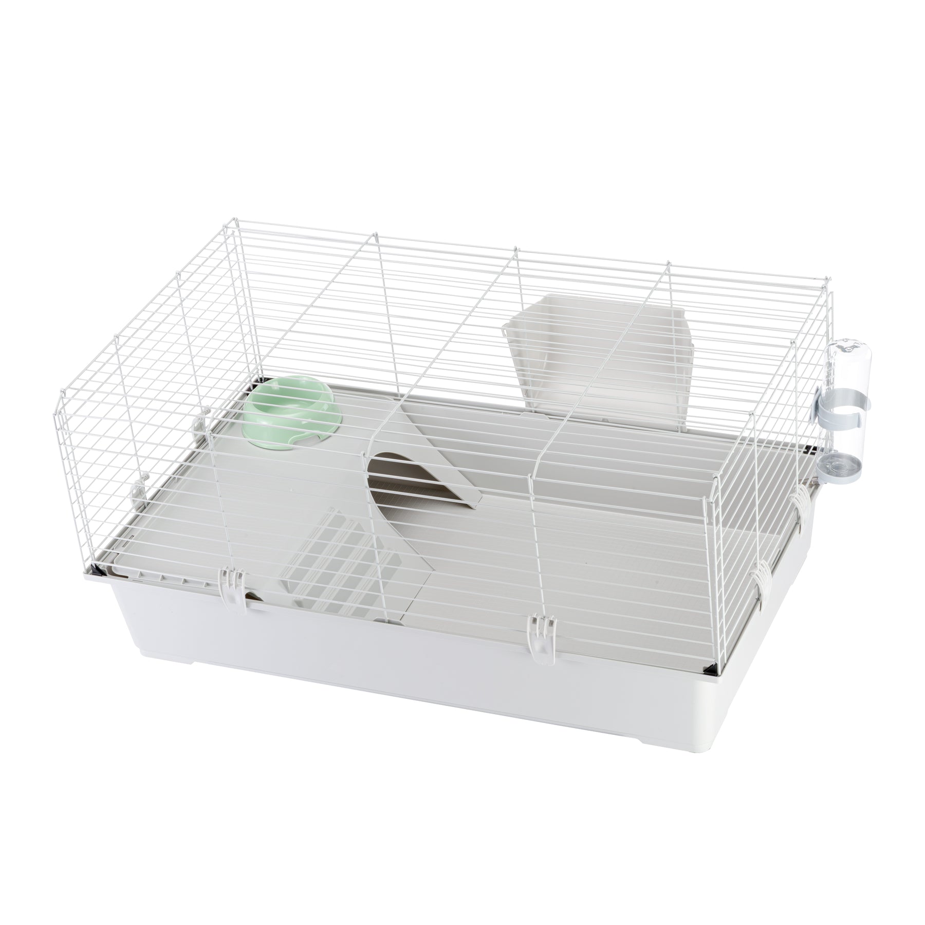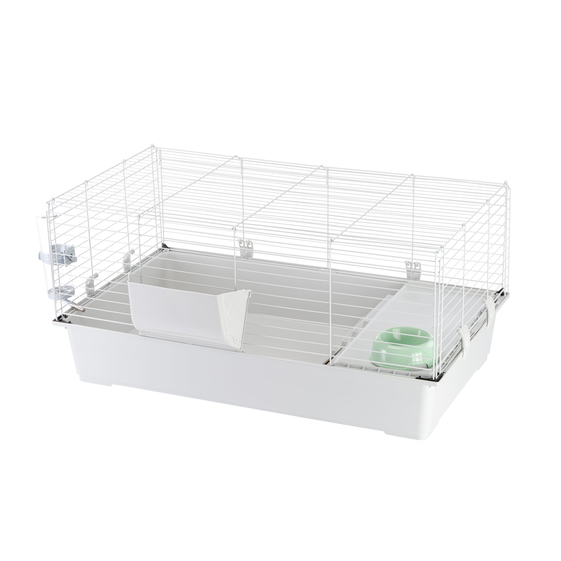 La jaula para conejos y conejillos de Indias Rabbit 100 es muy amplia y está dotada con todos los accesorios indispensables a tu mascota: un recipiente de plástico para el heno, un bebedero, un comedero y una casita para el reposo, todo fabricado en plástico.