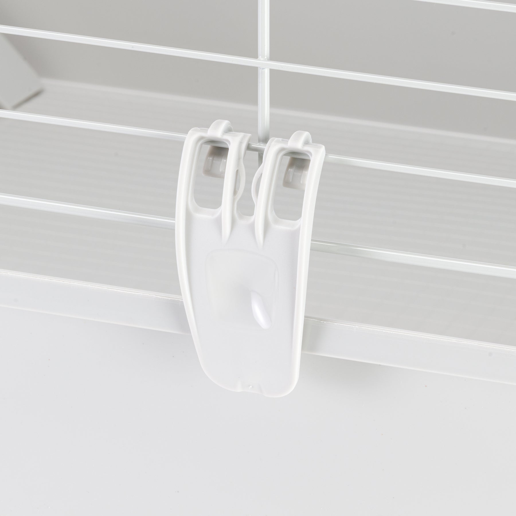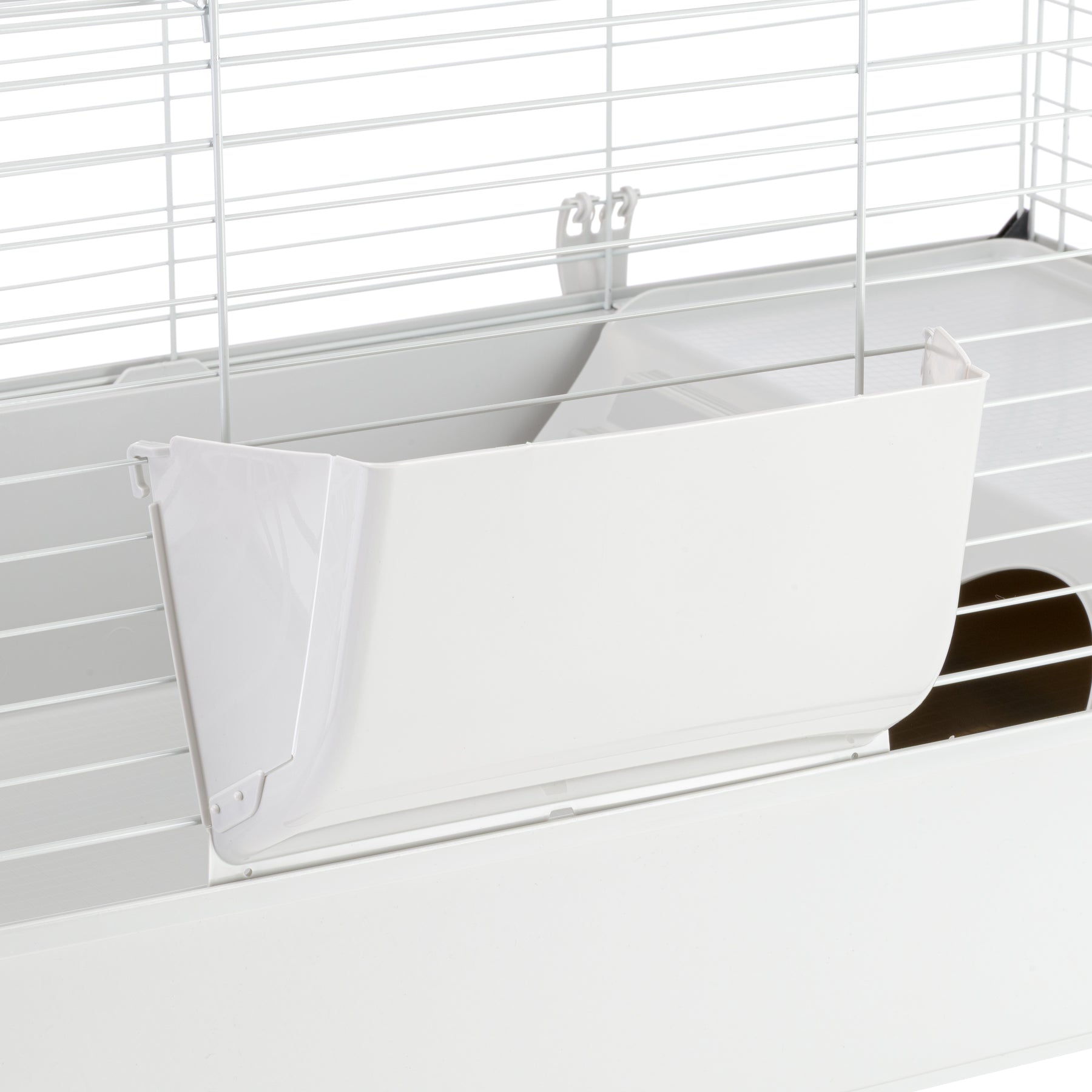 Ideal para conejos y conejillos de Indias, Rabbit 100 es una jaula realizada con una alta base de plástico coloreado sobre la cual se apoya una rejilla metálica. La rejilla, tratada con pinturas que la hacen resistente a la corrosión, presenta el lado frontal completamente abatible para acceder al interior con facilidad. Esto agiliza considerablemente las operaciones de limpieza cotidiana. En cambio, para una limpieza profunda, es suficiente separar la base, desenganchando los prácticos clips de los lados, que se han rediseñado para garantizar una mayor seguridad.