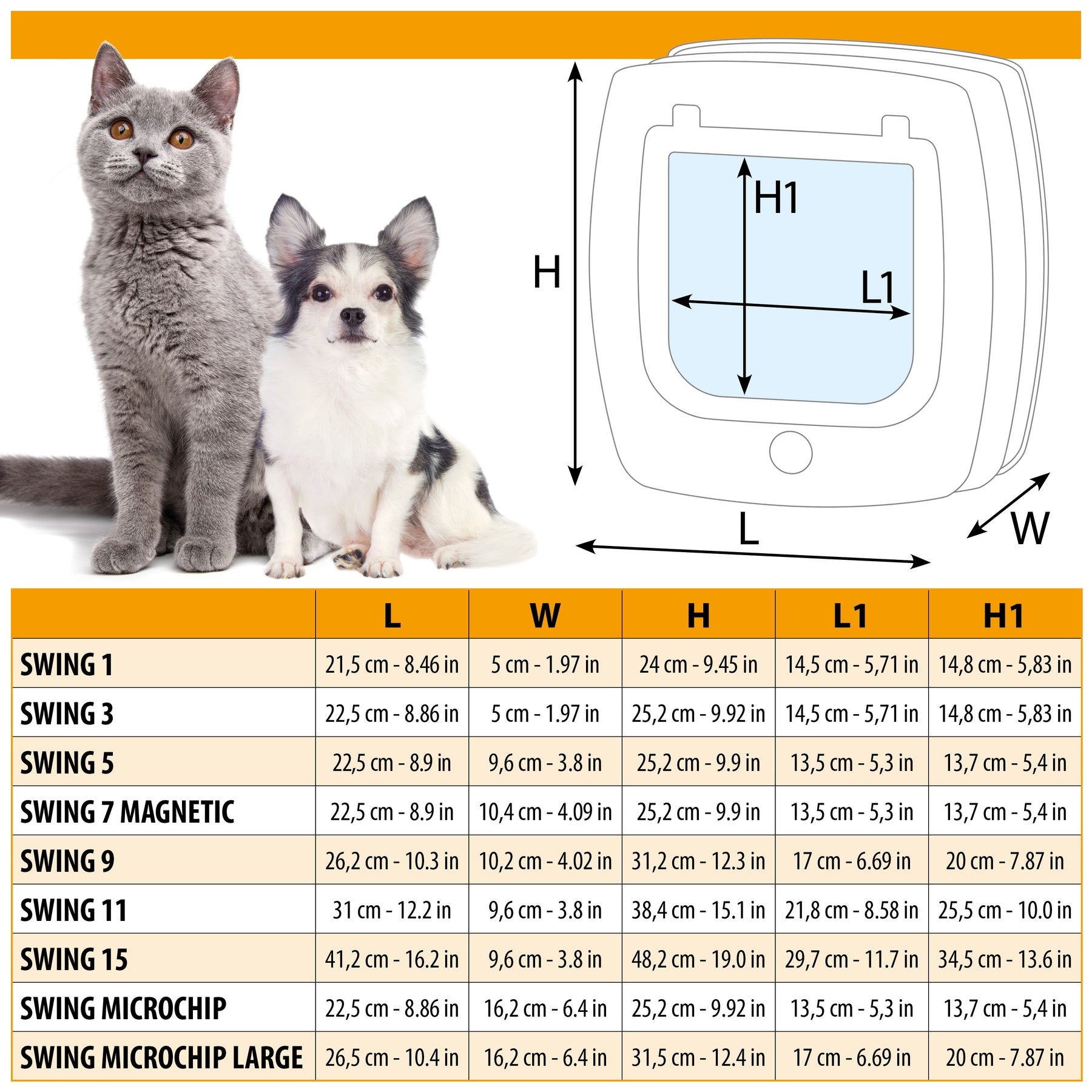 Para gatos y perros aconsejamos Swing 1, 3, o 5, para perros de talla media y grande son apropiados los modelos Swing 11 o 15, que se pueden también utilizar para gatos especialmente grandes. En cambio el modelo Swing 7, dotado de sistema magnético, es perfecto para los gatos.