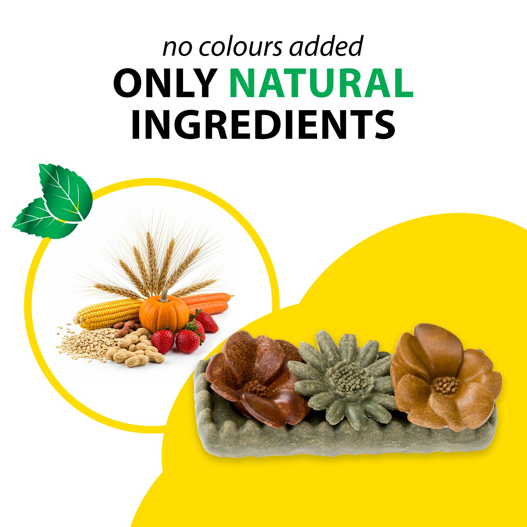 La textura dura y crujiente convierte Veggie Bites Flores en un eficaz snack masticable para roedores, estimulando la masticación prolongada. Esta acción favorece el desgaste natural de los dientes, que crecen continuamente en conejos y roedores, por lo que el producto puede utilizarse también como snack dental para conejos, cobayas y hámsters.